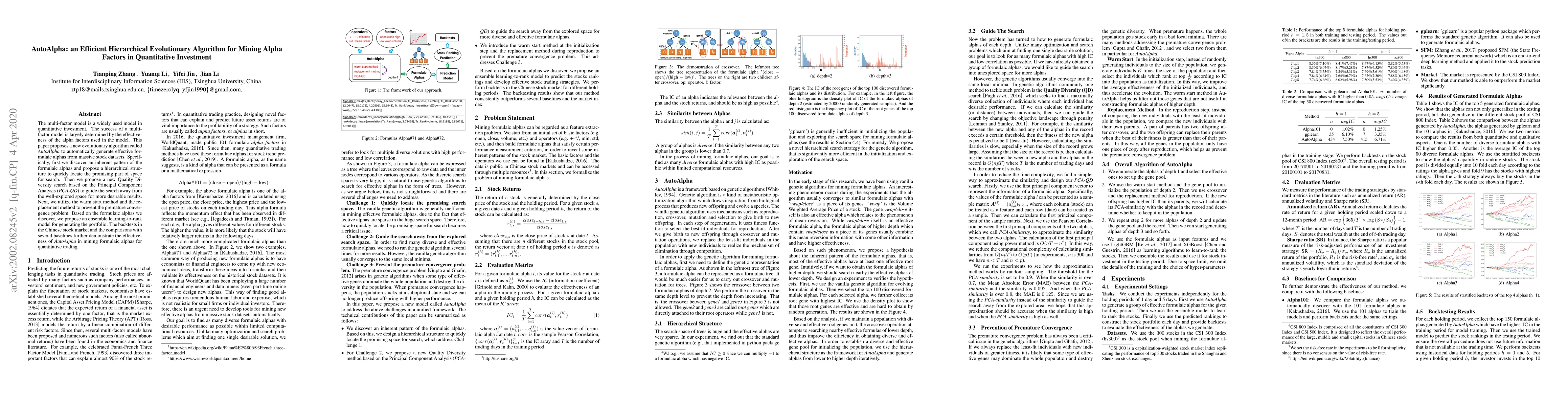 AutoAlpha is an efficient hierarchical evolutionary algorithm designed to automatically generate effective alpha factors for quantitative investment. It employs PCA-QD to explore new search spaces and ensemble learning for portfolio generation, demonstrating effectiveness in the Chinese stock market.