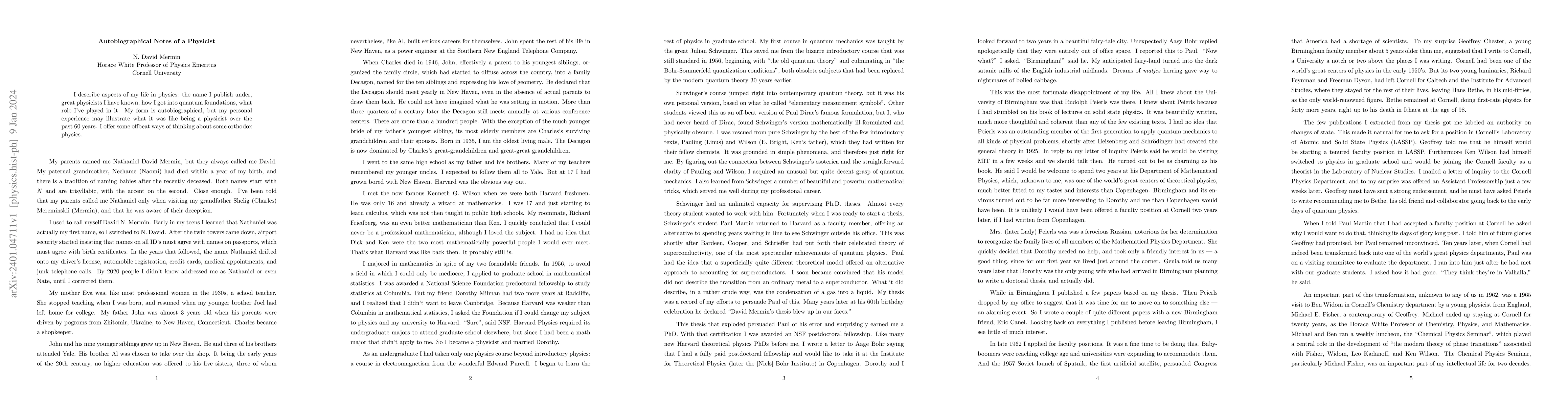 I describe aspects of my life in physics: the name I publish under, great physicists I have known, how I got into quantum foundations, what role I've played in it. My form is autobiographical, but my personal experience may illustrate what it was like being a physicist over the past 60 years. I offer some offbeat ways of thinking about some orthodox physics.