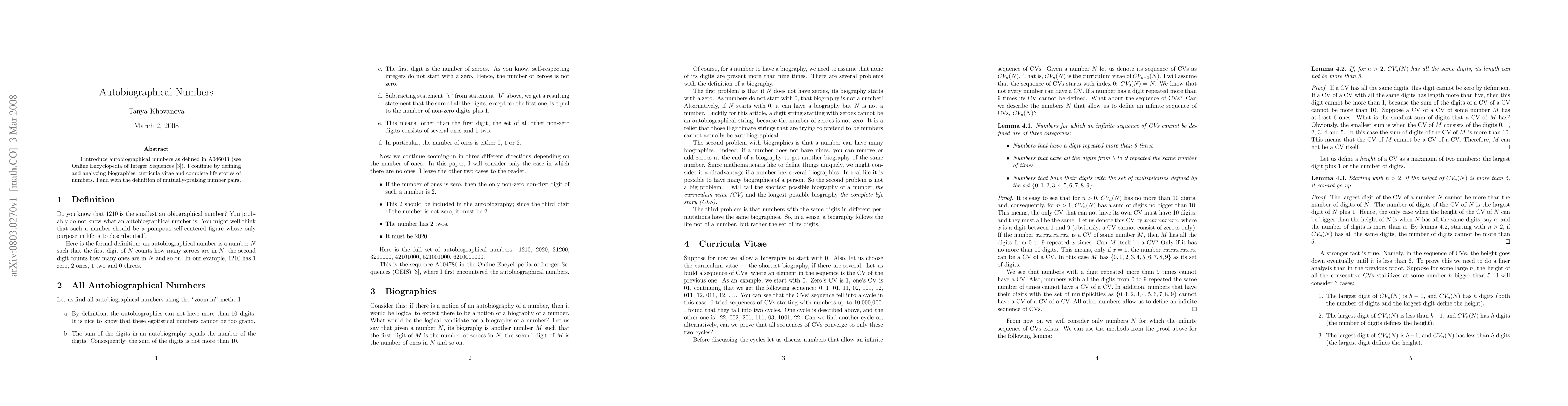 I introduce autobiographical numbers as defined in A046043 (see Online Encyclopedia of Integer Sequences). I continue by defining and analyzing biographies, curricula vitae and complete life stories of numbers. I end with the definition of mutually-praising number pairs.