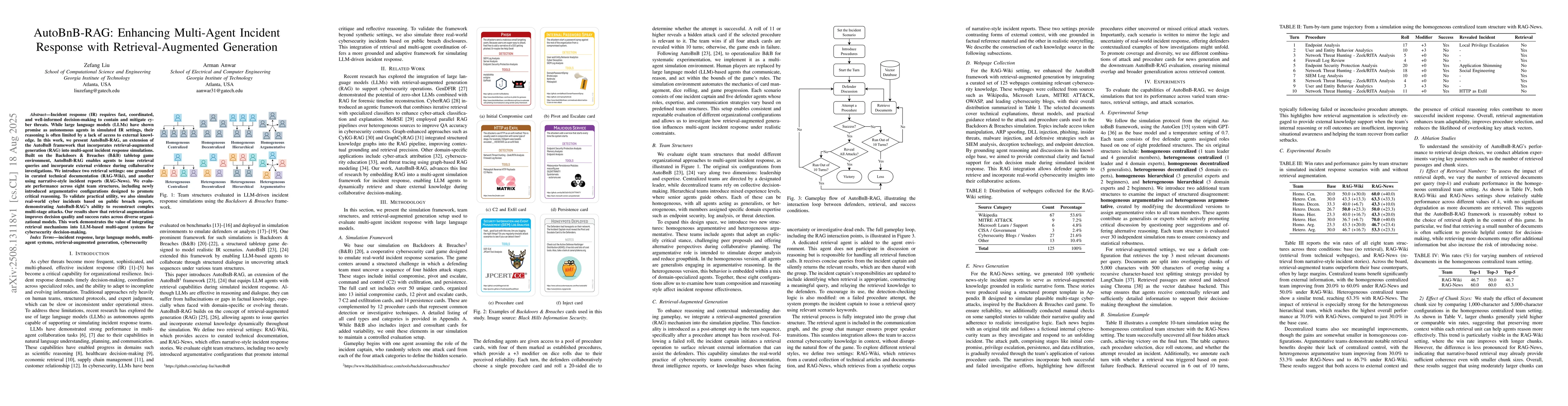 Incident response (IR) requires fast, coordinated, and well-informed decision-making to contain and mitigate cyber threats. While large language models (LLMs) have shown promise as autonomous agents in simulated IR settings, their reasoning is often limited by a lack of access to external knowledge. In this work, we present AutoBnB-RAG, an extension of the AutoBnB framework that incorporates retrieval-augmented generation (RAG) into multi-agent incident response simulations. Built on the Backdoors & Breaches (B&B) tabletop game environment, AutoBnB-RAG enables agents to issue retrieval queries and incorporate external evidence during collaborative investigations. We introduce two retrieval settings: one grounded in curated technical documentation (RAG-Wiki), and another using narrative-style incident reports (RAG-News). We evaluate performance across eight team structures, including newly introduced argumentative configurations designed to promote critical reasoning. To validate practical utility, we also simulate real-world cyber incidents based on public breach reports, demonstrating AutoBnB-RAG's ability to reconstruct complex multi-stage attacks. Our results show that retrieval augmentation improves decision quality and success rates across diverse organizational models. This work demonstrates the value of integrating retrieval mechanisms into LLM-based multi-agent systems for cybersecurity decision-making.