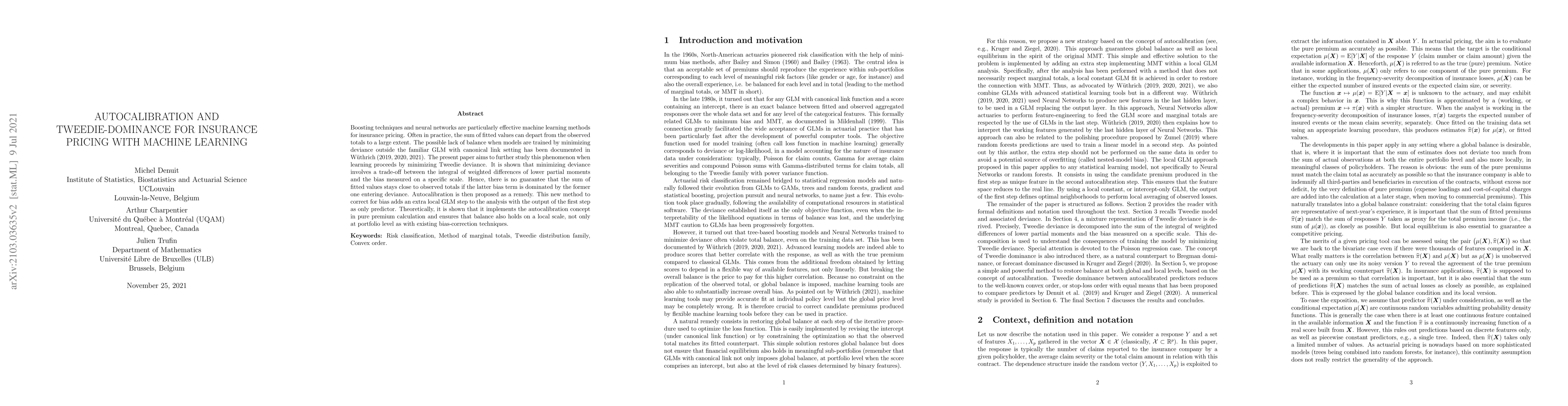 A new method called autocalibration is proposed to correct for bias in insurance pricing models trained using Tweedie deviance. This method ensures balance on a local scale, addressing the issue of sum of fitted values departing from observed totals.