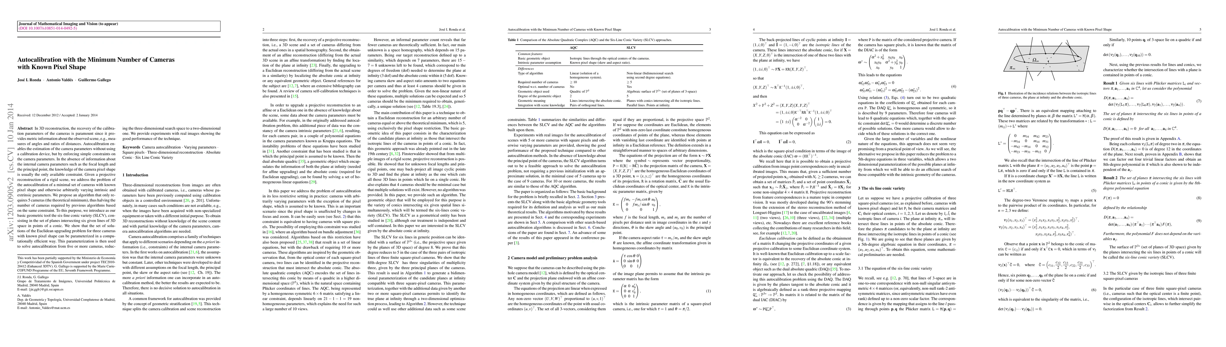 In 3D reconstruction, the recovery of the calibration parameters of the cameras is paramount since it provides metric information about the observed scene, e.g., measures of angles and ratios of distances. Autocalibration enables the estimation of the camera parameters without using a calibration device, but by enforcing simple constraints on the camera parameters. In the absence of information about the internal camera parameters such as the focal length and the principal point, the knowledge of the camera pixel shape is usually the only available constraint. Given a projective reconstruction of a rigid scene, we address the problem of the autocalibration of a minimal set of cameras with known pixel shape and otherwise arbitrarily varying intrinsic and extrinsic parameters. We propose an algorithm that only requires 5 cameras (the theoretical minimum), thus halving the number of cameras required by previous algorithms based on the same constraint. To this purpose, we introduce as our basic geometric tool the six-line conic variety (SLCV), consisting in the set of planes intersecting six given lines of 3D space in points of a conic. We show that the set of solutions of the Euclidean upgrading problem for three cameras with known pixel shape can be parameterized in a computationally efficient way. This parameterization is then used to solve autocalibration from five or more cameras, reducing the three-dimensional search space to a two-dimensional one. We provide experiments with real images showing the good performance of the technique.