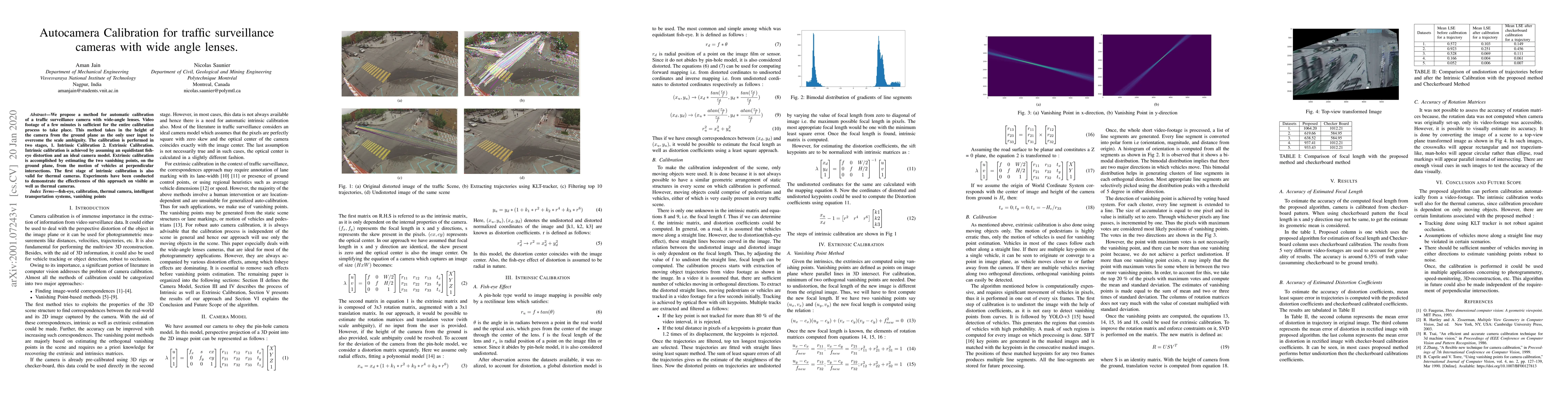 We propose a method for automatic calibration of a traffic surveillance camera with wide-angle lenses. Video footage of a few minutes is sufficient for the entire calibration process to take place. This method takes in the height of the camera from the ground plane as the only user input to overcome the scale ambiguity. The calibration is performed in two stages, 1. Intrinsic Calibration 2. Extrinsic Calibration. Intrinsic calibration is achieved by assuming an equidistant fisheye distortion and an ideal camera model. Extrinsic calibration is accomplished by estimating the two vanishing points, on the ground plane, from the motion of vehicles at perpendicular intersections. The first stage of intrinsic calibration is also valid for thermal cameras. Experiments have been conducted to demonstrate the effectiveness of this approach on visible as well as thermal cameras. Index Terms: fish-eye, calibration, thermal camera, intelligent transportation systems, vanishing points