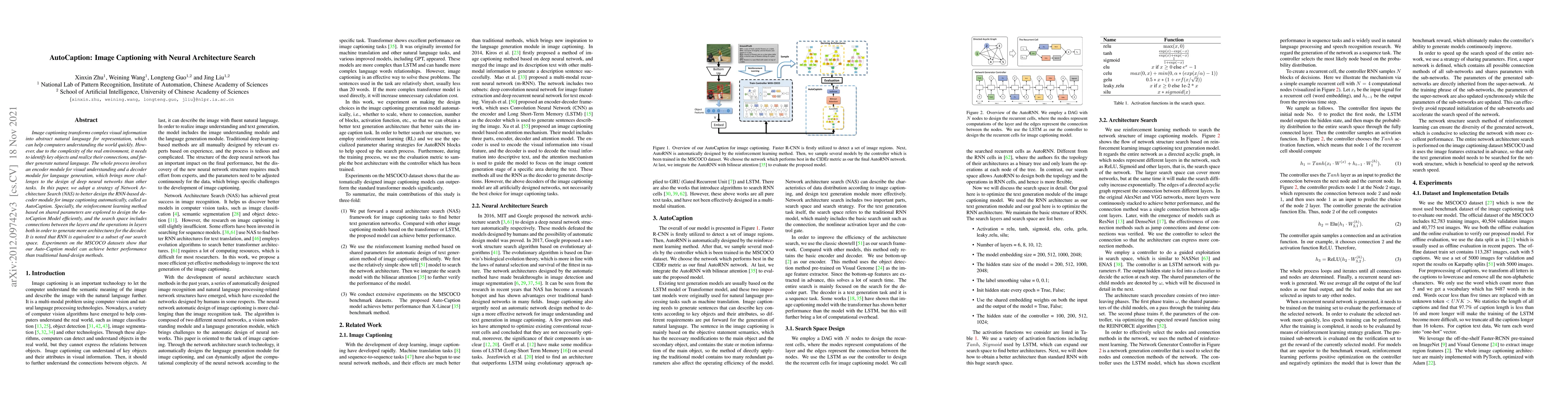Image captioning transforms complex visual information into abstract natural language for representation, which can help computers understanding the world quickly. However, due to the complexity of the real environment, it needs to identify key objects and realize their connections, and further generate natural language. The whole process involves a visual understanding module and a language generation module, which brings more challenges to the design of deep neural networks than other tasks. Neural Architecture Search (NAS) has shown its important role in a variety of image recognition tasks. Besides, RNN plays an essential role in the image captioning task. We introduce a AutoCaption method to better design the decoder module of the image captioning where we use the NAS to design the decoder module called AutoRNN automatically. We use the reinforcement learning method based on shared parameters for automatic design the AutoRNN efficiently. The search space of the AutoCaption includes connections between the layers and the operations in layers both, and it can make AutoRNN express more architectures. In particular, RNN is equivalent to a subset of our search space. Experiments on the MSCOCO datasets show that our AutoCaption model can achieve better performance than traditional hand-design methods.