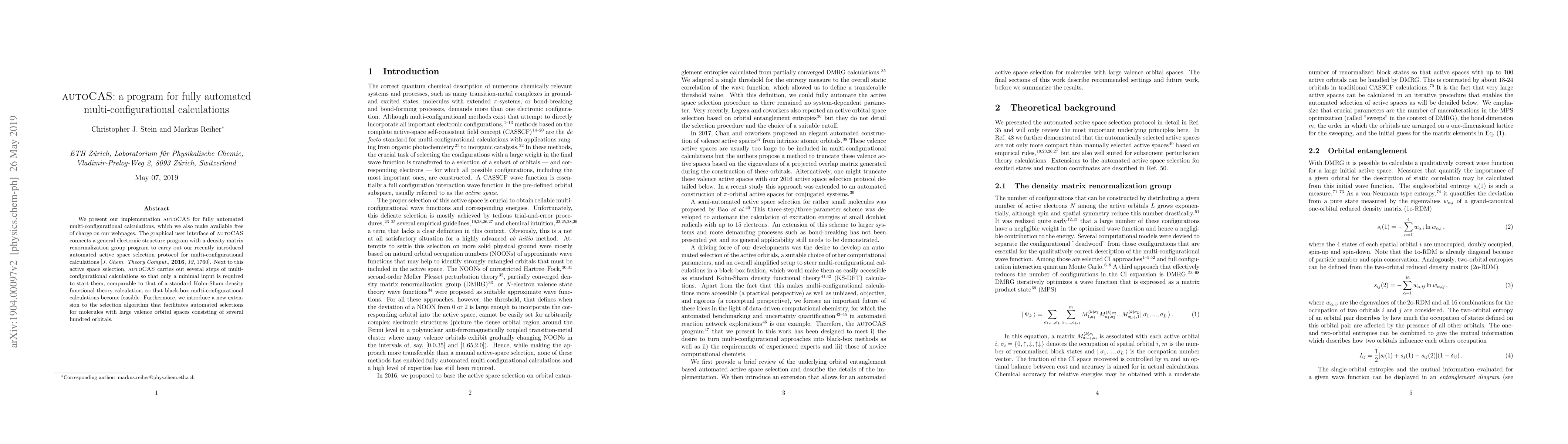 Summary: autoCAS is a free, fully automated program for multi-configurational calculations, featuring a graphical interface that connects general electronic structure programs with density matrix renormalization group methods. It simplifies the process by automating active space selection and other steps, making complex calculations as straightforward as standard DFT calculations.
