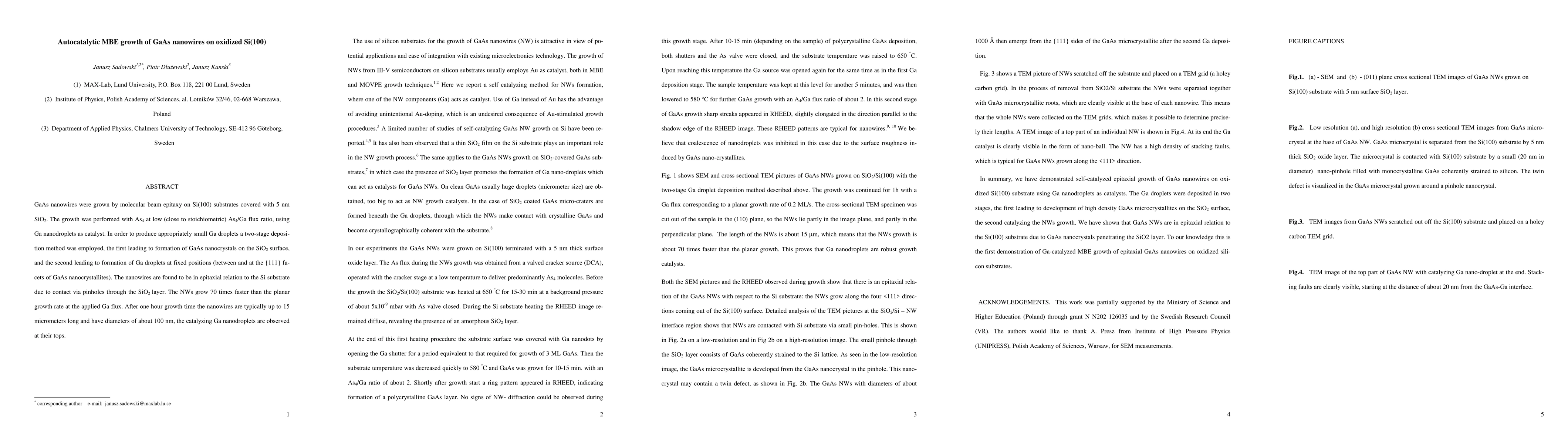 The paper introduces an autocatalytic MBE growth technique for GaAs nanowires on oxidized Si(100) using Ga nanodroplets as catalysts, facilitated by pinholes in the SiO2 layer.