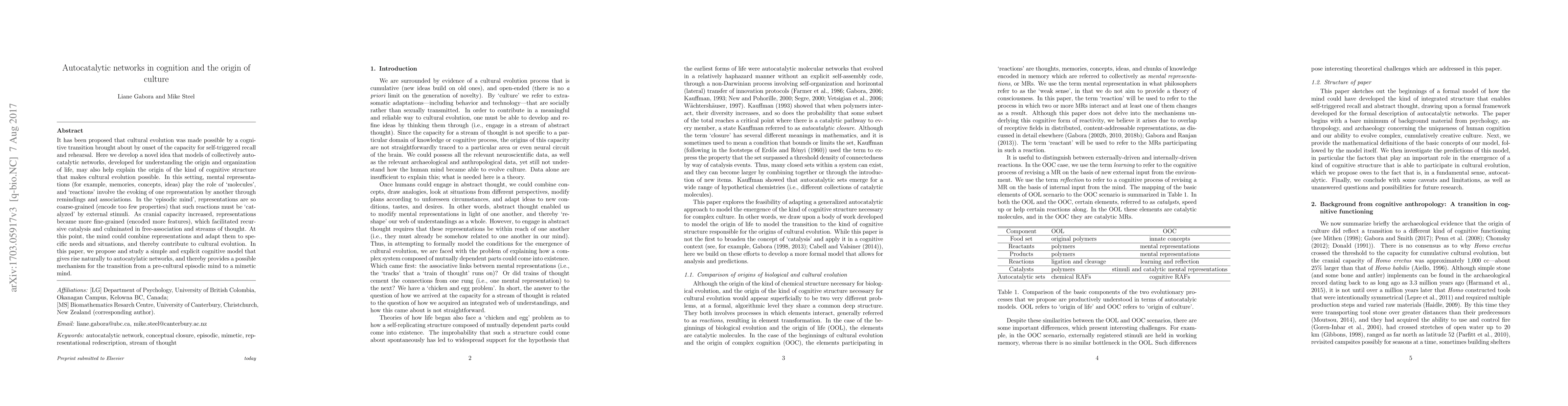 This paper proposes that cognitive structures enabling cultural evolution can be modeled using autocatalytic networks, originally developed to explain the origin of life. It suggests that as mental representations became more fine-grained, they began to catalyze thought processes, leading to the emergence of a mimetic mind capable of cultural evolution.