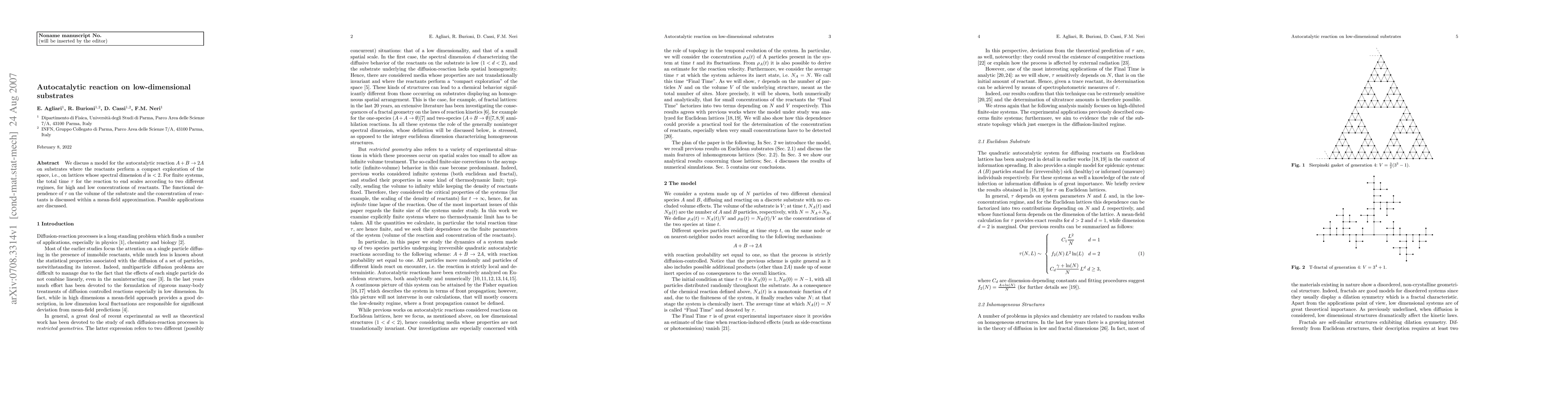 This paper models an autocatalytic reaction $A+B\to 2A$ on low-dimensional substrates, exploring how reaction time scales with substrate volume and reactant concentration under different concentration regimes. Applications and implications of the findings are also briefly discussed.