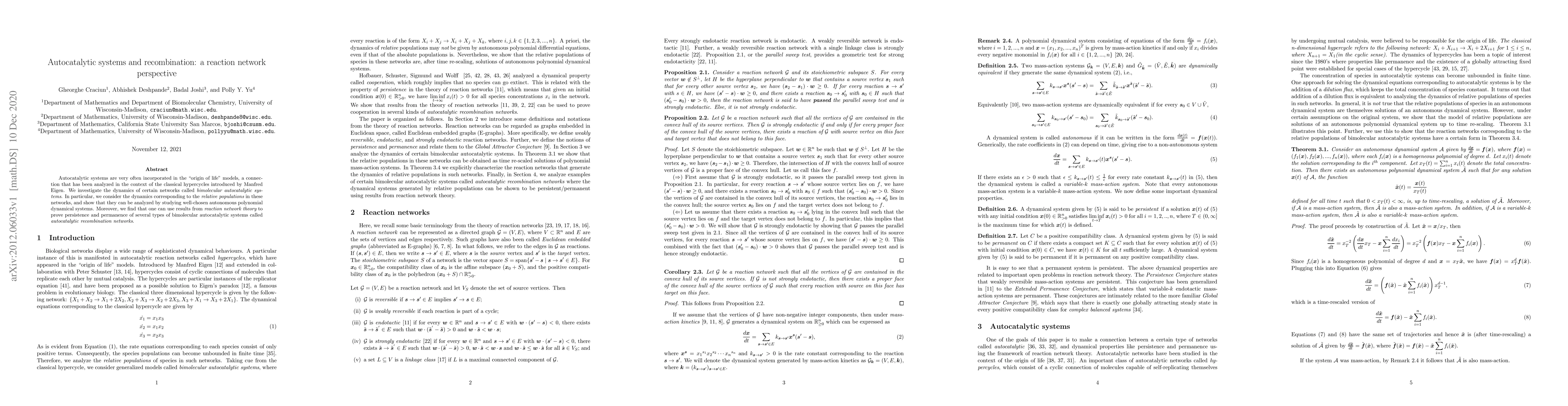 This paper explores the dynamics of bimolecular autocatalytic systems, demonstrating their analysis through autonomous polynomial dynamical systems and using reaction network theory to prove persistence and permanence in autocatalytic recombination networks.