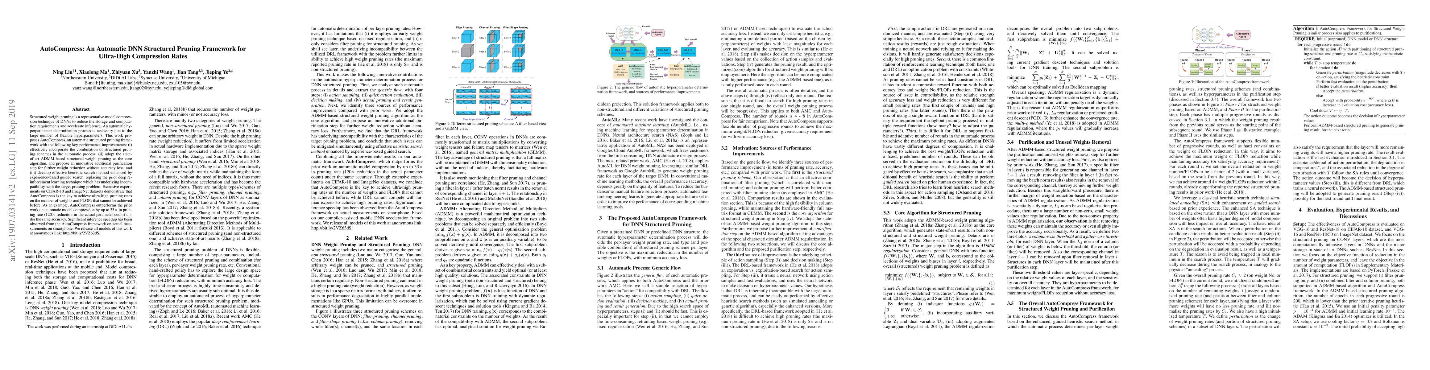 AutoCompress is an automatic structured pruning framework designed to achieve ultra-high compression rates for deep neural networks (DNNs) by effectively combining structured pruning schemes and incorporating an innovative purification step. It outperforms prior methods by up to 33x in pruning rate, significantly reducing model size and improving inference speed on smartphones.