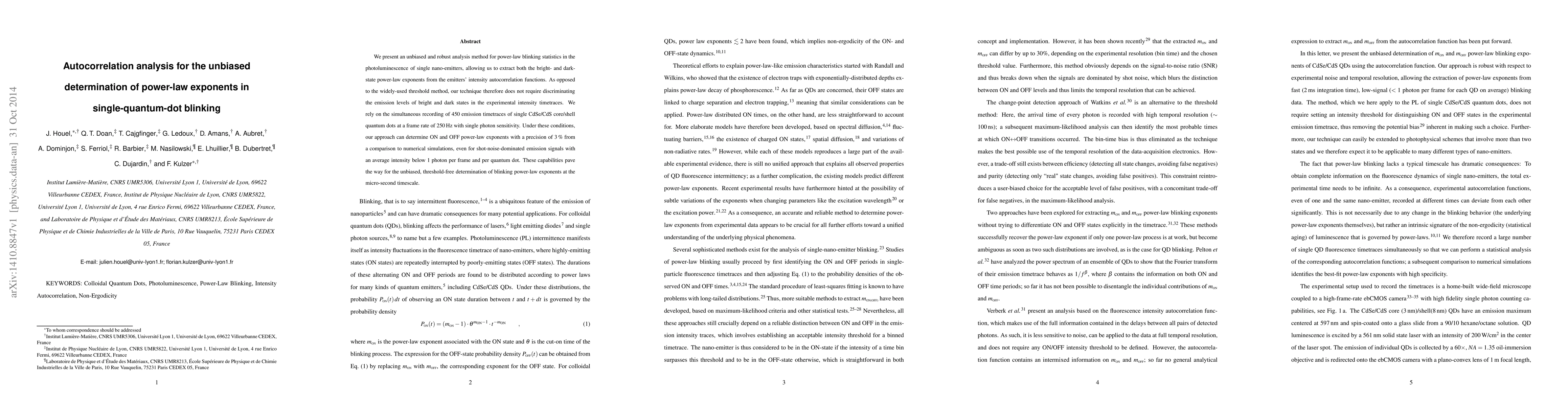 We present an unbiased and robust analysis method for power-law blinking statistics in the photoluminescence of single nano-emitters, allowing us to extract both the bright- and dark-state power-law exponents from the emitters' intensity autocorrelation functions. As opposed to the widely-used threshold method, our technique therefore does not require discriminating the emission levels of bright and dark states in the experimental intensity timetraces. We rely on the simultaneous recording of 450 emission timetraces of single CdSe/CdS core/shell quantum dots at a frame rate of 250 Hz with single photon sensitivity. Under these conditions, our approach can determine ON and OFF power-law exponents with a precision of 3% from a comparison to numerical simulations, even for shot-noise-dominated emission signals with an average intensity below 1 photon per frame and per quantum dot. These capabilities pave the way for the unbiased, threshold-free determination of blinking power-law exponents at the micro-second timescale.