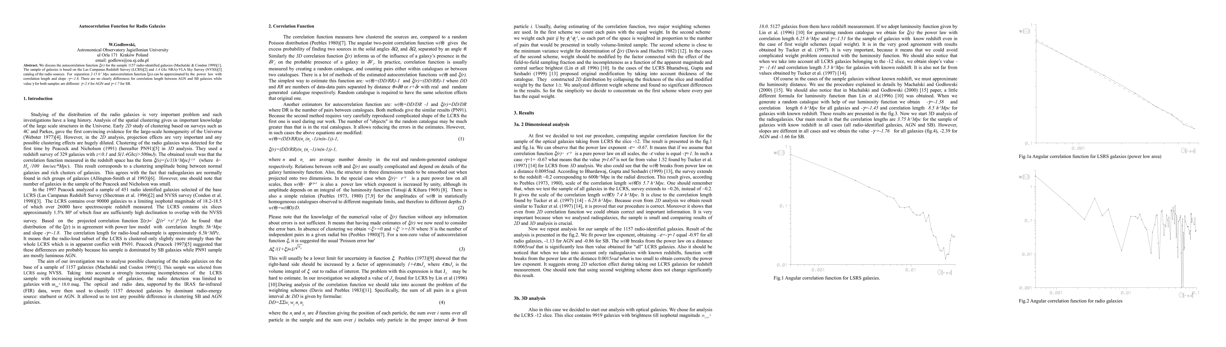 This study analyzes the autocorrelation function of 1157 radio galaxies, finding that AGN and SB galaxies have different correlation lengths and slopes, with AGN having a longer correlation length and steeper slope than SB galaxies.