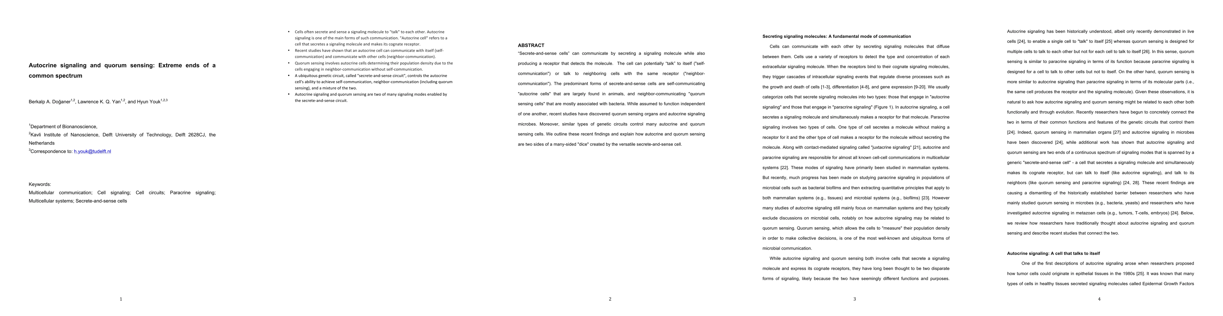 This paper explores the similarities between autocrine signaling in animals and quorum sensing in bacteria, revealing that these forms of cell communication are not mutually exclusive but rather represent different ends of a spectrum. The study highlights the discovery of quorum sensing organs in microbes and autocrine signaling in bacteria, suggesting a unified genetic framework governing both processes.