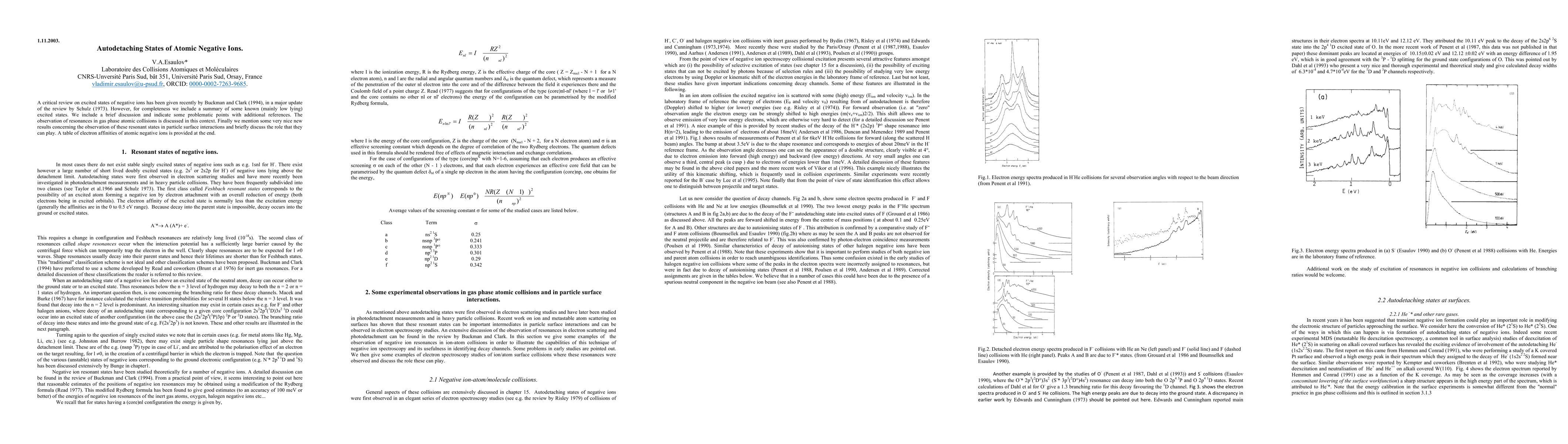 This paper reviews excited states of atomic negative ions, including their electron affinities and resonances in gas phase collisions, with implications for particle surface interactions.