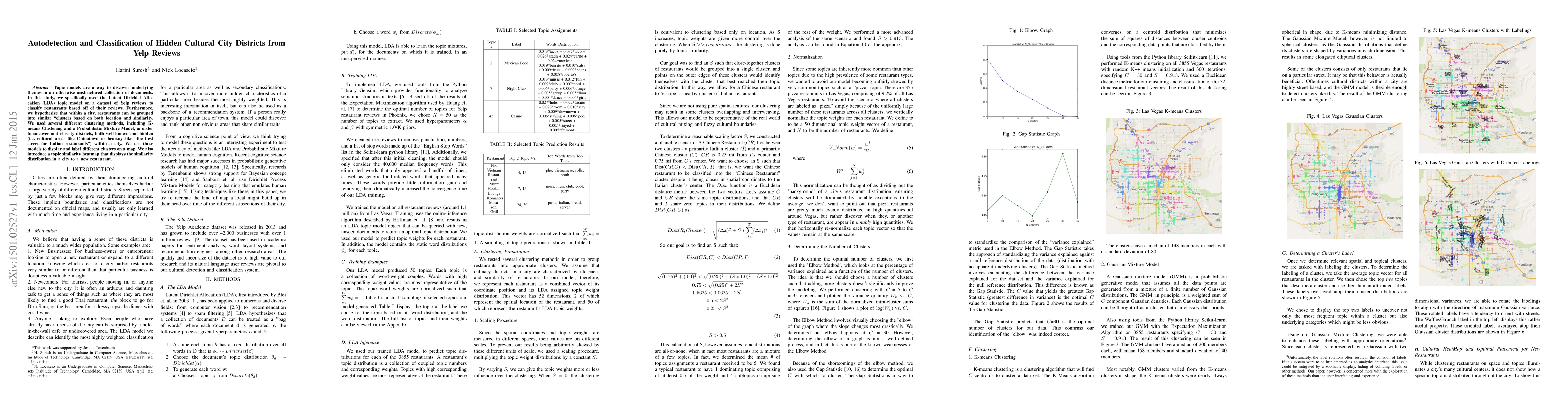 Topic models are a way to discover underlying themes in an otherwise unstructured collection of documents. In this study, we specifically used the Latent Dirichlet Allocation (LDA) topic model on a dataset of Yelp reviews to classify restaurants based off of their reviews. Furthermore, we hypothesize that within a city, restaurants can be grouped into similar "clusters" based on both location and similarity. We used several different clustering methods, including K-means Clustering and a Probabilistic Mixture Model, in order to uncover and classify districts, both well-known and hidden (i.e. cultural areas like Chinatown or hearsay like "the best street for Italian restaurants") within a city. We use these models to display and label different clusters on a map. We also introduce a topic similarity heatmap that displays the similarity distribution in a city to a new restaurant.