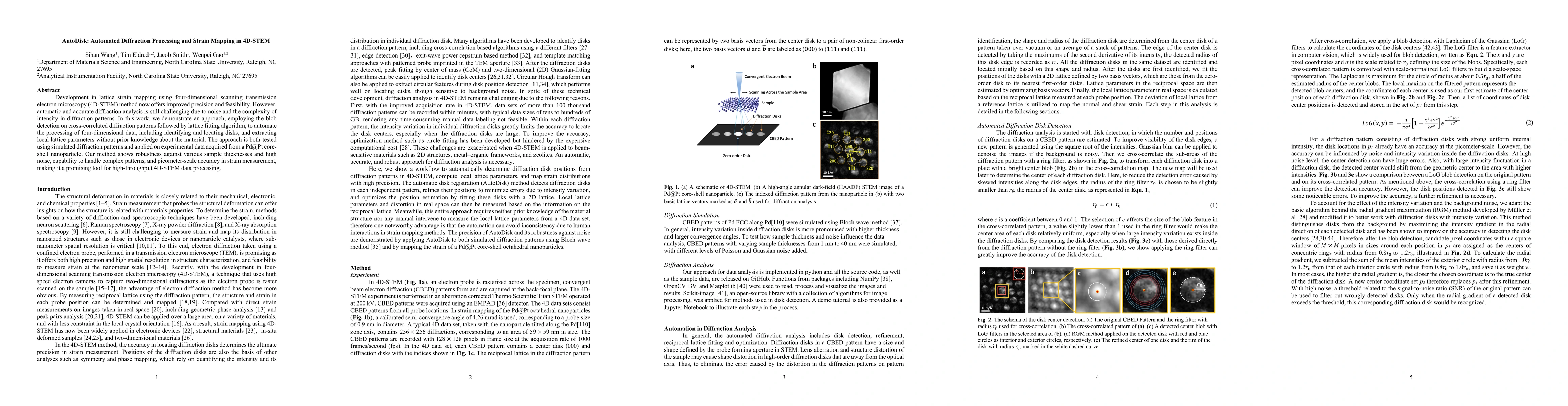 AutoDisk automates the processing of 4D-STEM data by employing blob detection and lattice fitting, enabling precise strain mapping in nanoparticles. The method demonstrates robust performance across various sample conditions and achieves picometer-scale accuracy, promising high-throughput analysis for complex diffraction patterns.