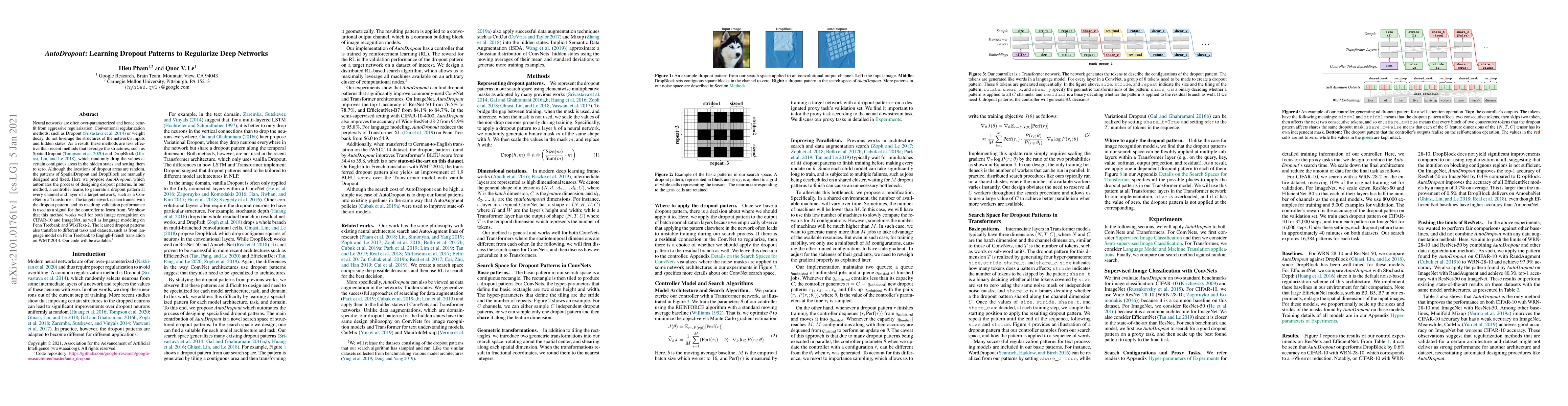 AutoDropout proposes a method to learn adaptive dropout patterns for deep networks, improving regularization over conventional methods. The controller dynamically generates dropout patterns for each channel and layer, enhancing performance on various tasks and datasets, demonstrating transferability across different domains.