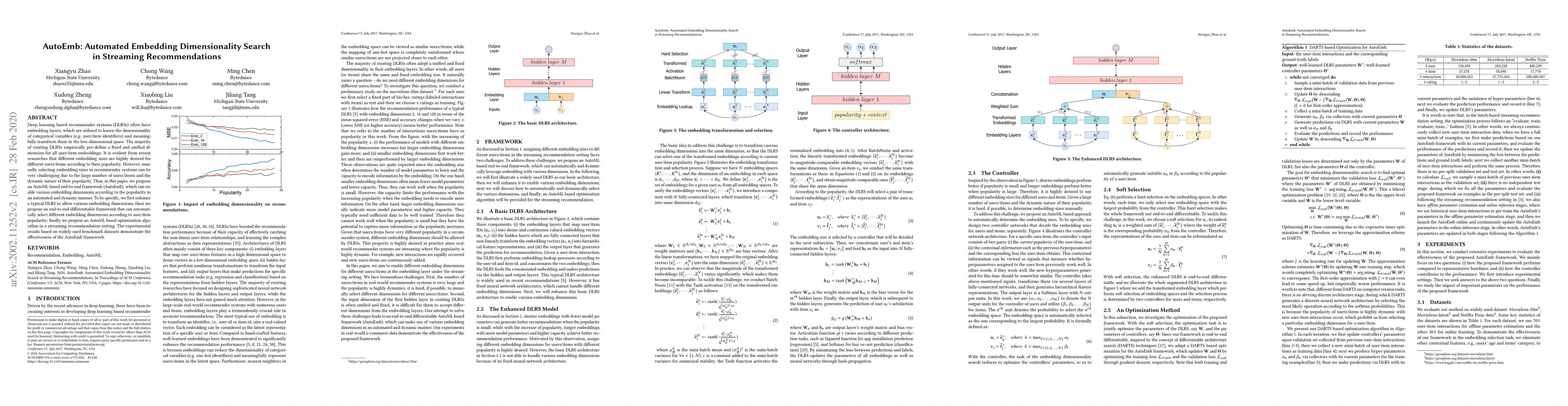 This paper proposes AutoEmb, an AutoML framework that automates the search for optimal embedding dimensions in deep learning-based recommender systems. It dynamically adjusts embedding sizes according to user/item popularity, improving recommendation accuracy and efficiency in streaming settings.