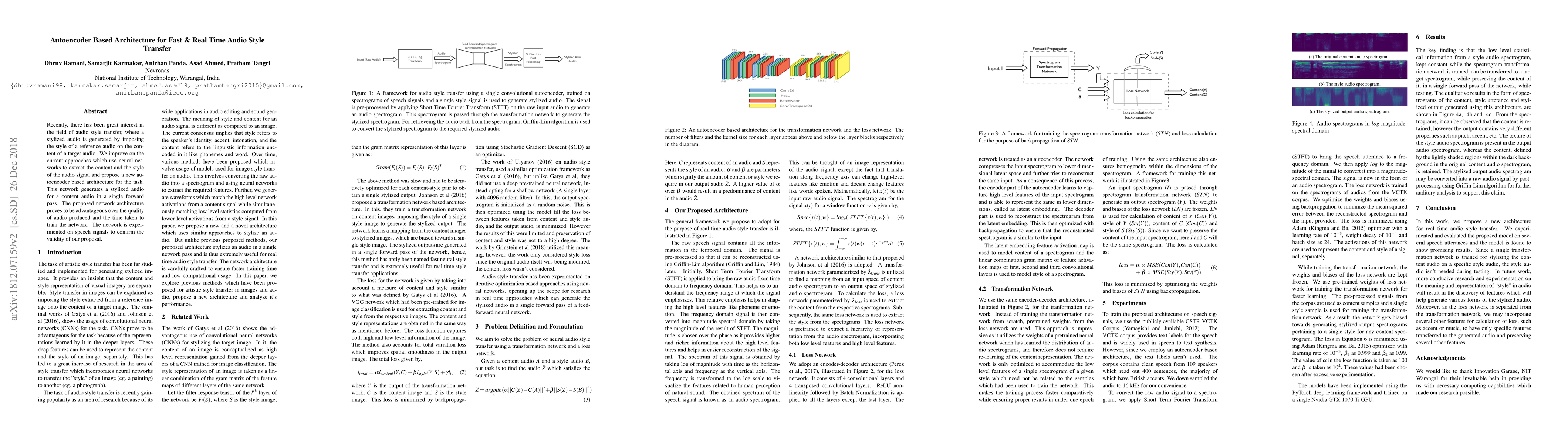 Recently, there has been great interest in the field of audio style transfer, where a stylized audio is generated by imposing the style of a reference audio on the content of a target audio. We improve on the current approaches which use neural networks to extract the content and the style of the audio signal and propose a new autoencoder based architecture for the task. This network generates a stylized audio for a content audio in a single forward pass. The proposed network architecture proves to be advantageous over the quality of audio produced and the time taken to train the network. The network is experimented on speech signals to confirm the validity of our proposal.