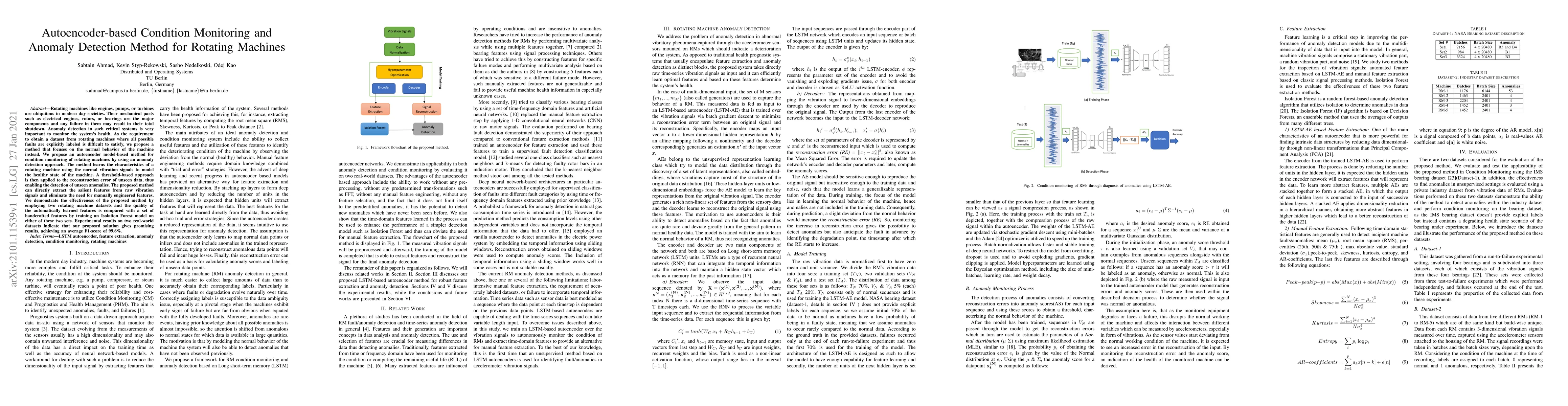 This paper proposes an autoencoder-based method for anomaly detection in rotating machines by learning the normal vibration signals to model the healthy state. The method detects anomalies using a threshold-based approach on reconstruction error, achieving an average F1-score of 99.6% on two datasets.