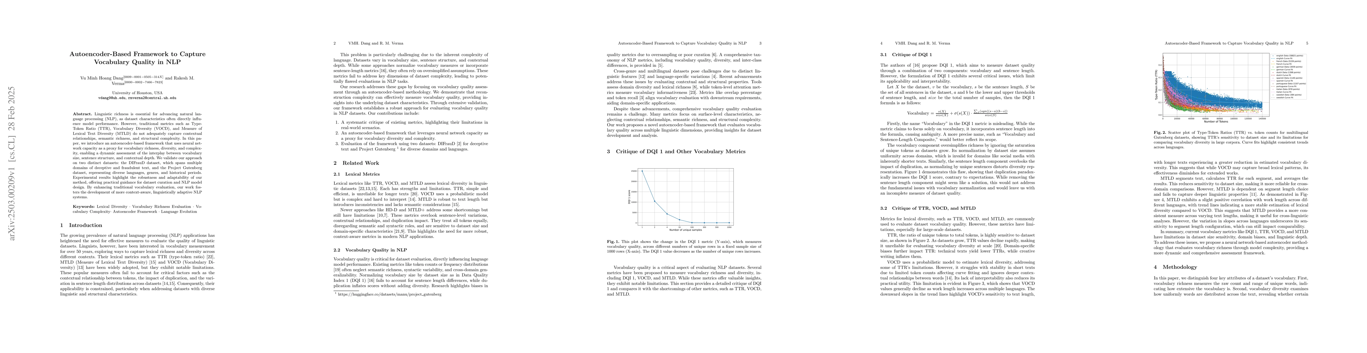This paper proposes an autoencoder-based framework to dynamically assess vocabulary richness, diversity, and complexity in NLP, surpassing traditional metrics. The method is validated on diverse datasets, demonstrating its robustness and aiding in dataset curation and NLP model design.