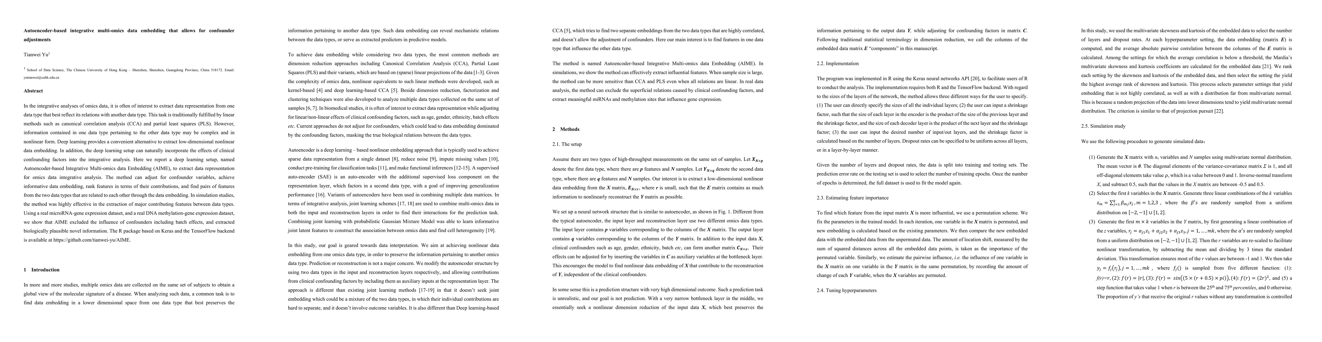 This paper introduces AIME, a deep learning-based method for integrative multi-omics data embedding that adjusts for confounders. It effectively extracts nonlinear relationships between data types and identifies relevant feature pairs, demonstrating strong performance in simulations and real datasets.