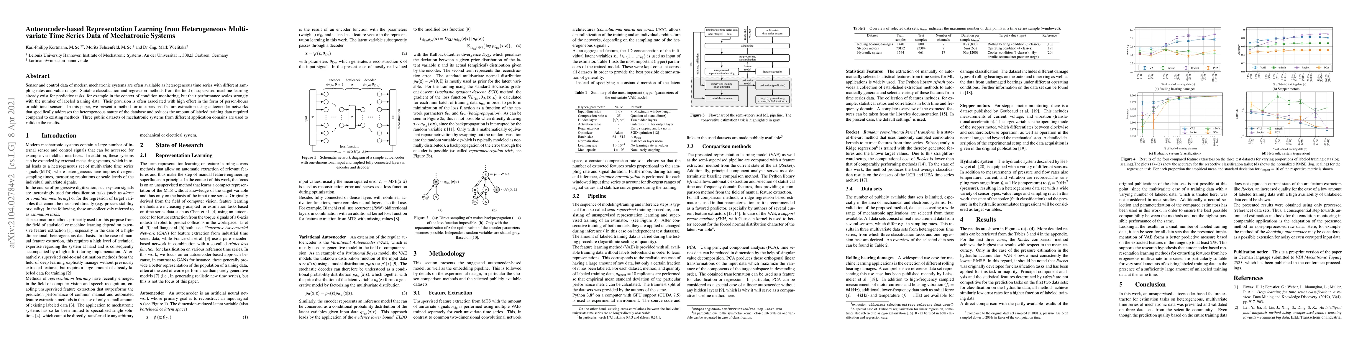 Sensor and control data of modern mechatronic systems are often available as heterogeneous time series with different sampling rates and value ranges. Suitable classification and regression methods from the field of supervised machine learning already exist for predictive tasks, for example in the context of condition monitoring, but their performance scales strongly with the number of labeled training data. Their provision is often associated with high effort in the form of person-hours or additional sensors. In this paper, we present a method for unsupervised feature extraction using autoencoder networks that specifically addresses the heterogeneous nature of the database and reduces the amount of labeled training data required compared to existing methods. Three public datasets of mechatronic systems from different application domains are used to validate the results.