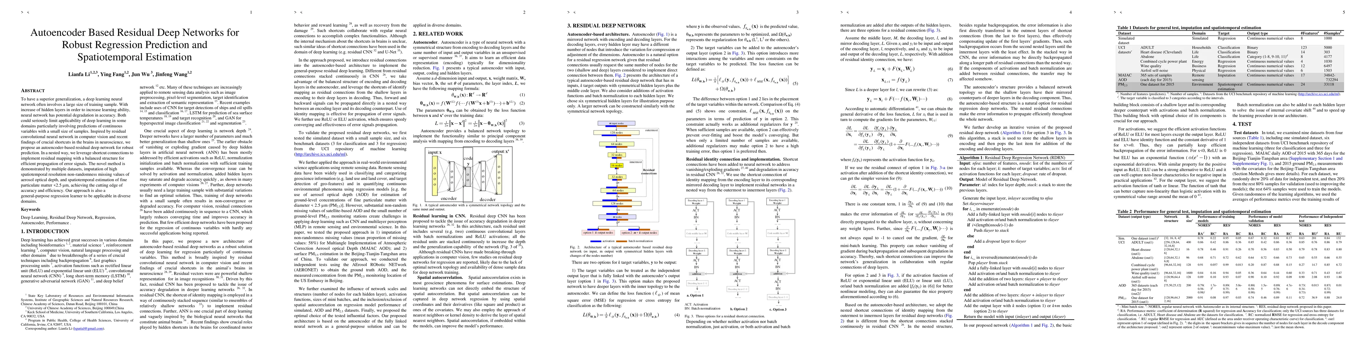 To have a superior generalization, a deep learning neural network often involves a large size of training sample. With increase of hidden layers in order to increase learning ability, neural network has potential degradation in accuracy. Both could seriously limit applicability of deep learning in some domains particularly involving predictions of continuous variables with a small size of samples. Inspired by residual convolutional neural network in computer vision and recent findings of crucial shortcuts in the brains in neuroscience, we propose an autoencoder-based residual deep network for robust prediction. In a nested way, we leverage shortcut connections to implement residual mapping with a balanced structure for efficient propagation of error signals. The novel method is demonstrated by multiple datasets, imputation of high spatiotemporal resolution non-randomness missing values of aerosol optical depth, and spatiotemporal estimation of fine particulate matter <2.5 \mu m, achieving the cutting edge of accuracy and efficiency. Our approach is also a general-purpose regression learner to be applicable in diverse domains.