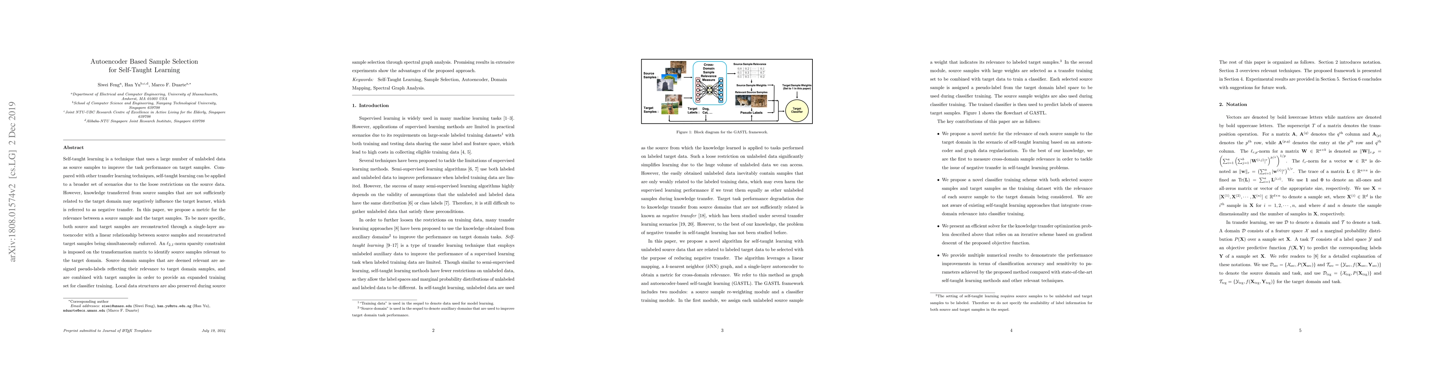 Self-taught learning is a technique that uses a large number of unlabeled data as source samples to improve the task performance on target samples. Compared with other transfer learning techniques, self-taught learning can be applied to a broader set of scenarios due to the loose restrictions on the source data. However, knowledge transferred from source samples that are not sufficiently related to the target domain may negatively influence the target learner, which is referred to as negative transfer. In this paper, we propose a metric for the relevance between a source sample and the target samples. To be more specific, both source and target samples are reconstructed through a single-layer autoencoder with a linear relationship between source samples and reconstructed target samples being simultaneously enforced. An $\ell_{2,1}$-norm sparsity constraint is imposed on the transformation matrix to identify source samples relevant to the target domain. Source domain samples that are deemed relevant are assigned pseudo-labels reflecting their relevance to target domain samples, and are combined with target samples in order to provide an expanded training set for classifier training. Local data structures are also preserved during source sample selection through spectral graph analysis. Promising results in extensive experiments show the advantages of the proposed approach.