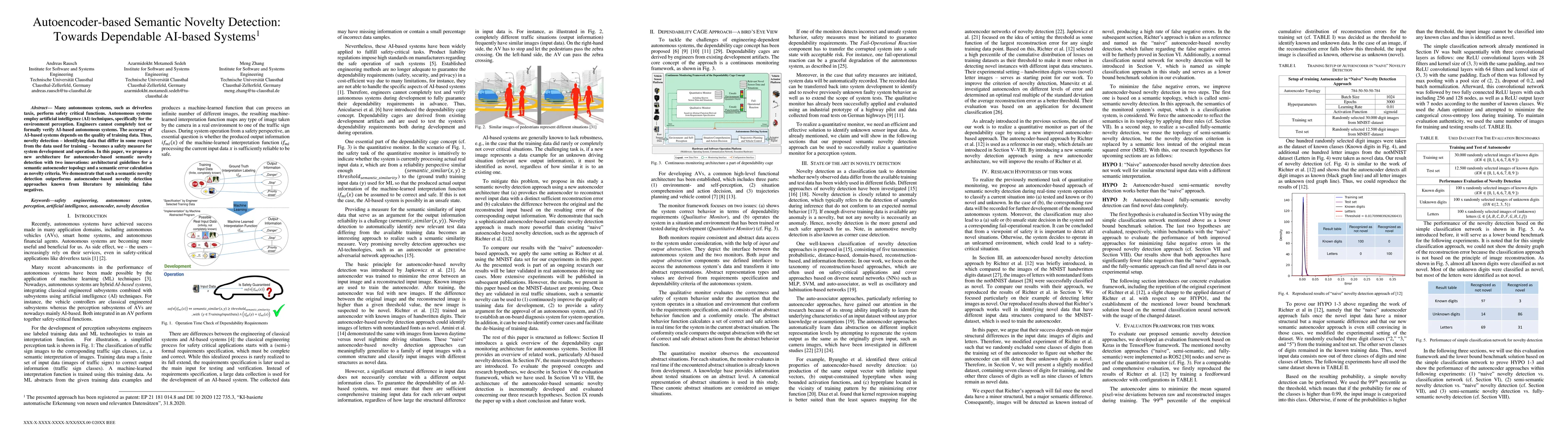 This paper proposes a novel autoencoder architecture for semantic novelty detection in AI-based systems, introducing architectural guidelines and a semantic error calculation to improve safety. It demonstrates superior performance over existing methods by reducing false negatives, crucial for dependable autonomous systems.