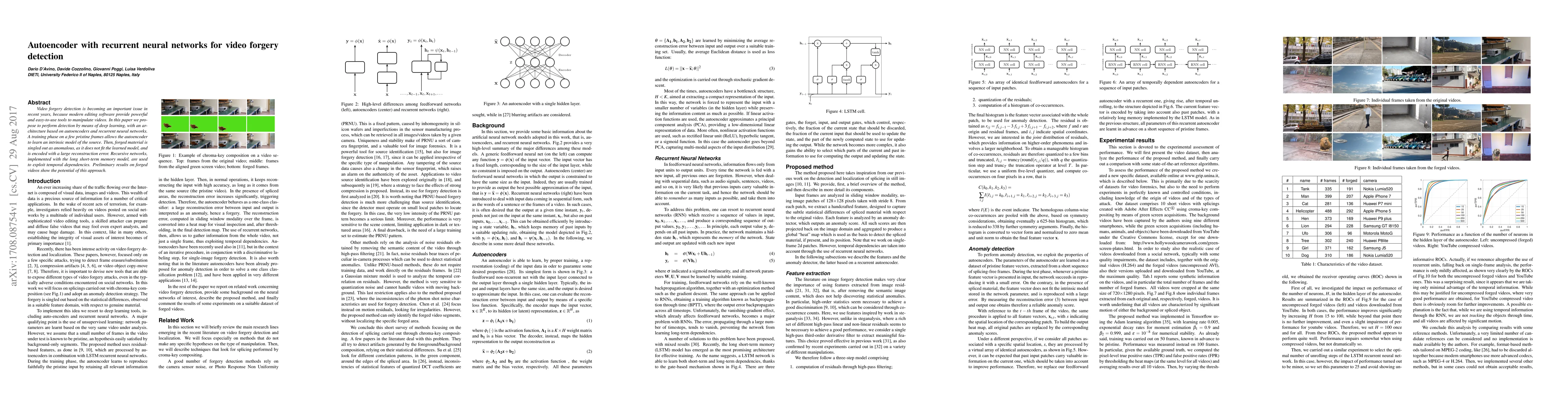 Video forgery detection is becoming an important issue in recent years, because modern editing software provide powerful and easy-to-use tools to manipulate videos. In this paper we propose to perform detection by means of deep learning, with an architecture based on autoencoders and recurrent neural networks. A training phase on a few pristine frames allows the autoencoder to learn an intrinsic model of the source. Then, forged material is singled out as anomalous, as it does not fit the learned model, and is encoded with a large reconstruction error. Recursive networks, implemented with the long short-term memory model, are used to exploit temporal dependencies. Preliminary results on forged videos show the potential of this approach.