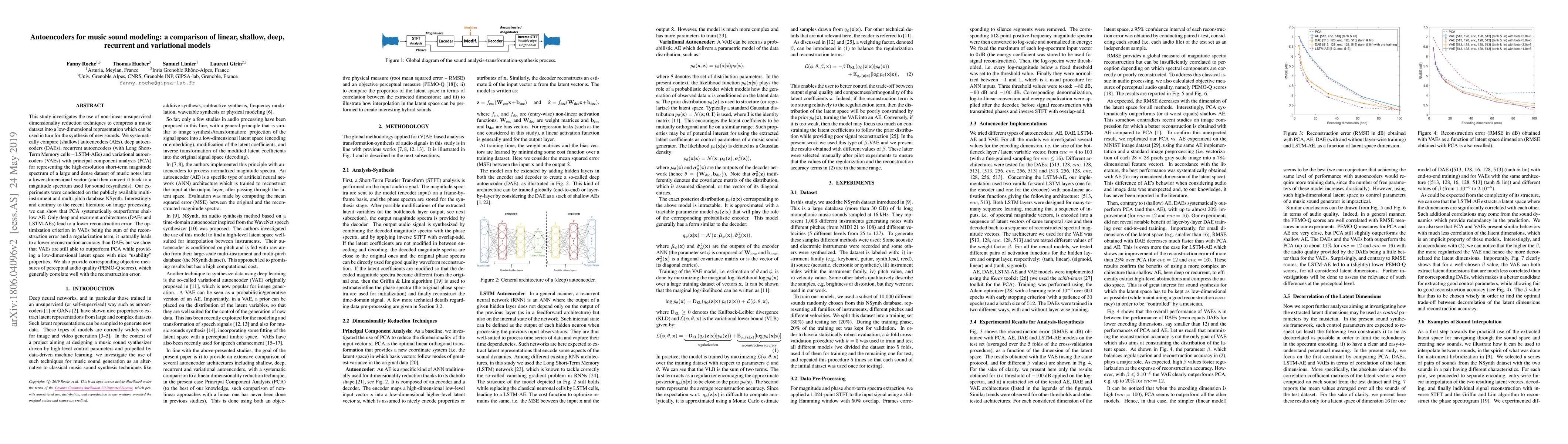 Researchers compared various autoencoder models for music sound modeling, finding that deep and recurrent models outperform shallow ones in terms of reconstruction error, while variational autoencoders provide a lower-dimensional latent space with good usability properties.