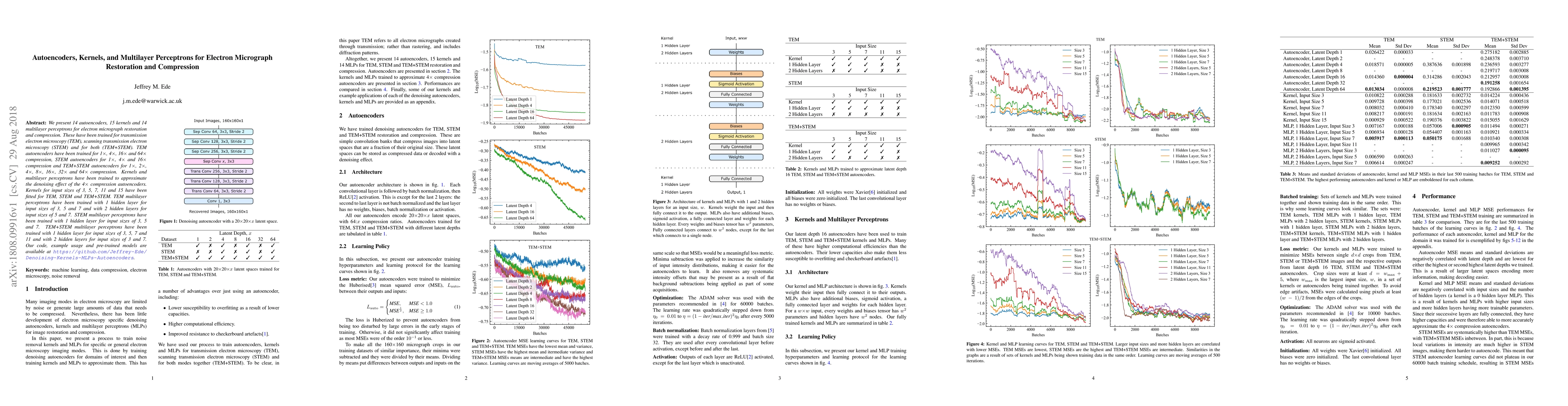 We present 14 autoencoders, 15 kernels and 14 multilayer perceptrons for electron micrograph restoration and compression. These have been trained for transmission electron microscopy (TEM), scanning transmission electron microscopy (STEM) and for both (TEM+STEM). TEM autoencoders have been trained for 1$\times$, 4$\times$, 16$\times$ and 64$\times$ compression, STEM autoencoders for 1$\times$, 4$\times$ and 16$\times$ compression and TEM+STEM autoencoders for 1$\times$, 2$\times$, 4$\times$, 8$\times$, 16$\times$, 32$\times$ and 64$\times$ compression. Kernels and multilayer perceptrons have been trained to approximate the denoising effect of the 4$\times$ compression autoencoders. Kernels for input sizes of 3, 5, 7, 11 and 15 have been fitted for TEM, STEM and TEM+STEM. TEM multilayer perceptrons have been trained with 1 hidden layer for input sizes of 3, 5 and 7 and with 2 hidden layers for input sizes of 5 and 7. STEM multilayer perceptrons have been trained with 1 hidden layer for input sizes of 3, 5 and 7. TEM+STEM multilayer perceptrons have been trained with 1 hidden layer for input sizes of 3, 5, 7 and 11 and with 2 hidden layers for input sizes of 3 and 7. Our code, example usage and pre-trained models are available at https://github.com/Jeffrey-Ede/Denoising-Kernels-MLPs-Autoencoders