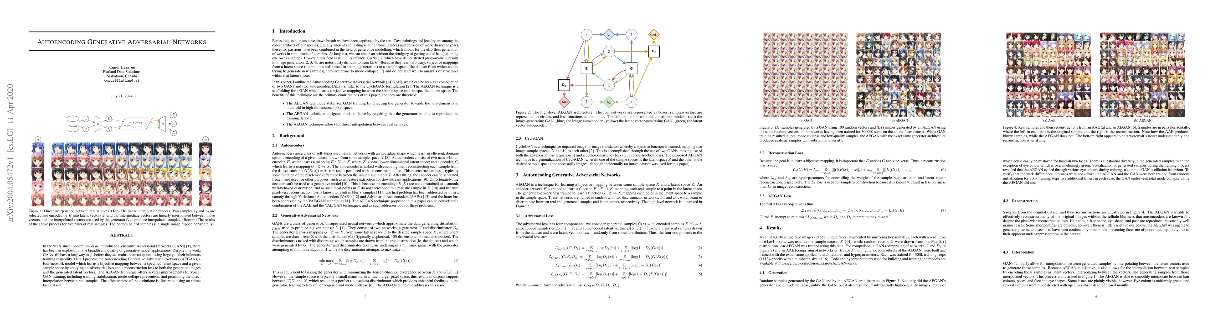 The Autoencoding Generative Adversarial Network (AEGAN) aims to stabilize GAN training and prevent mode collapse by incorporating adversarial and reconstruction losses on both generated images and latent vectors, demonstrated successfully with an anime face dataset.