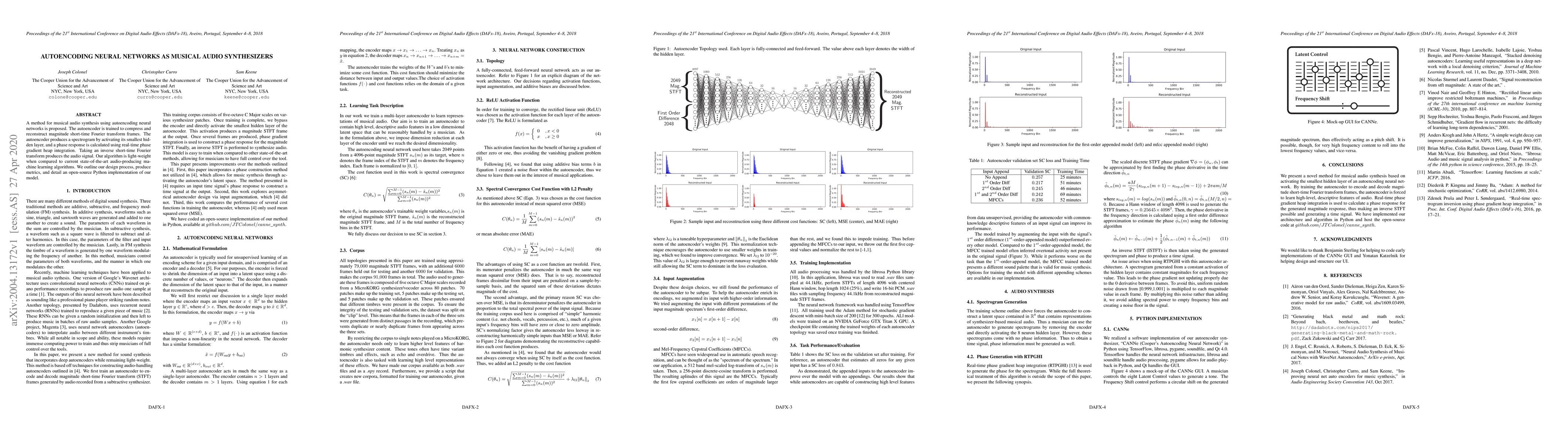 This paper proposes a method for musical audio synthesis using autoencoding neural networks, which compresses and reconstructs magnitude short-time Fourier transform frames. The autoencoder generates audio signals by integrating phase responses and producing an inverse short-time Fourier transform, offering a lightweight alternative to current machine learning algorithms.