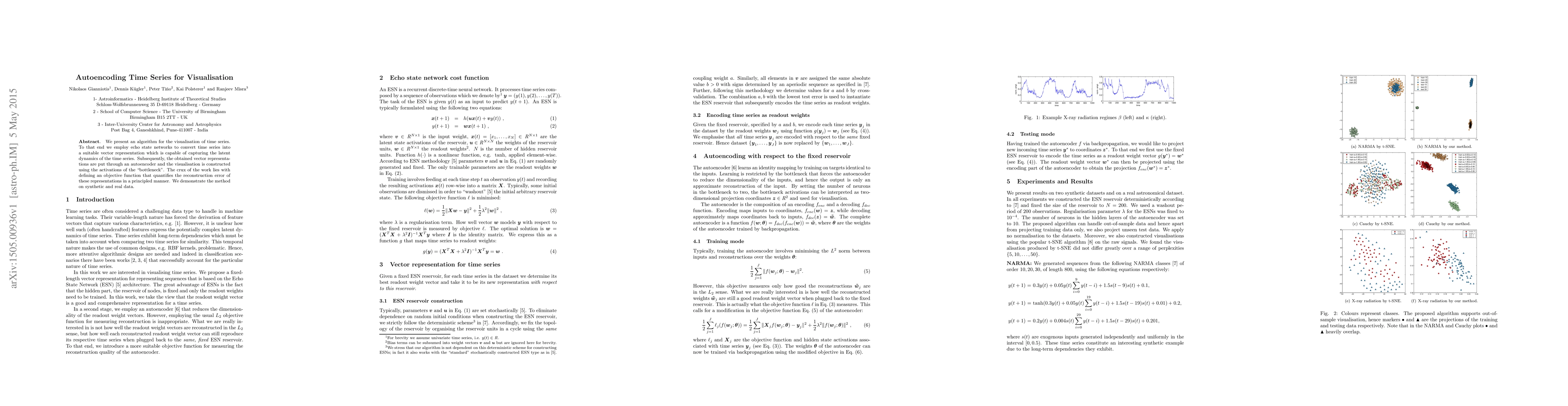 This paper proposes an algorithm for visualizing time series using echo state networks and autoencoders to convert time series into vector representations that capture latent dynamics. The method is demonstrated on synthetic and real data, focusing on an objective function that measures reconstruction error.