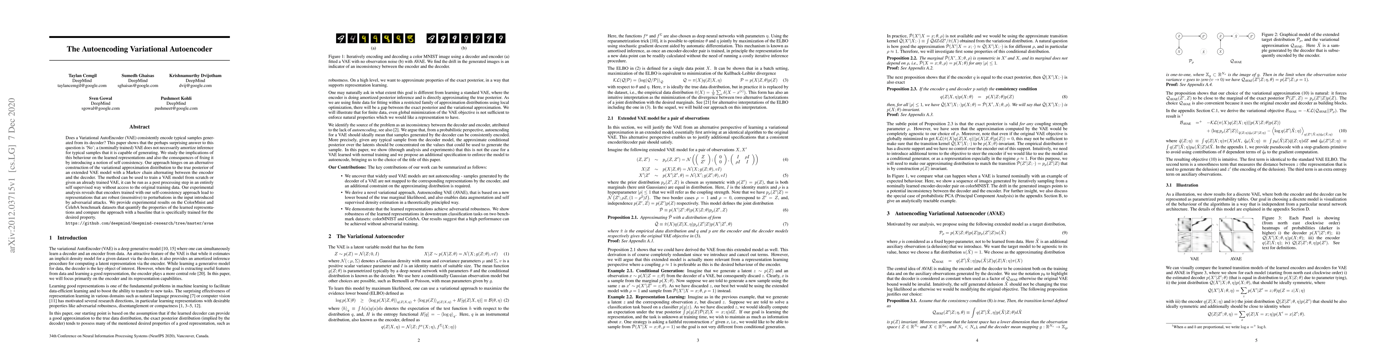 Does a Variational AutoEncoder (VAE) consistently encode typical samples generated from its decoder? This paper shows that the perhaps surprising answer to this question is `No'; a (nominally trained) VAE does not necessarily amortize inference for typical samples that it is capable of generating. We study the implications of this behaviour on the learned representations and also the consequences of fixing it by introducing a notion of self consistency. Our approach hinges on an alternative construction of the variational approximation distribution to the true posterior of an extended VAE model with a Markov chain alternating between the encoder and the decoder. The method can be used to train a VAE model from scratch or given an already trained VAE, it can be run as a post processing step in an entirely self supervised way without access to the original training data. Our experimental analysis reveals that encoders trained with our self-consistency approach lead to representations that are robust (insensitive) to perturbations in the input introduced by adversarial attacks. We provide experimental results on the ColorMnist and CelebA benchmark datasets that quantify the properties of the learned representations and compare the approach with a baseline that is specifically trained for the desired property.