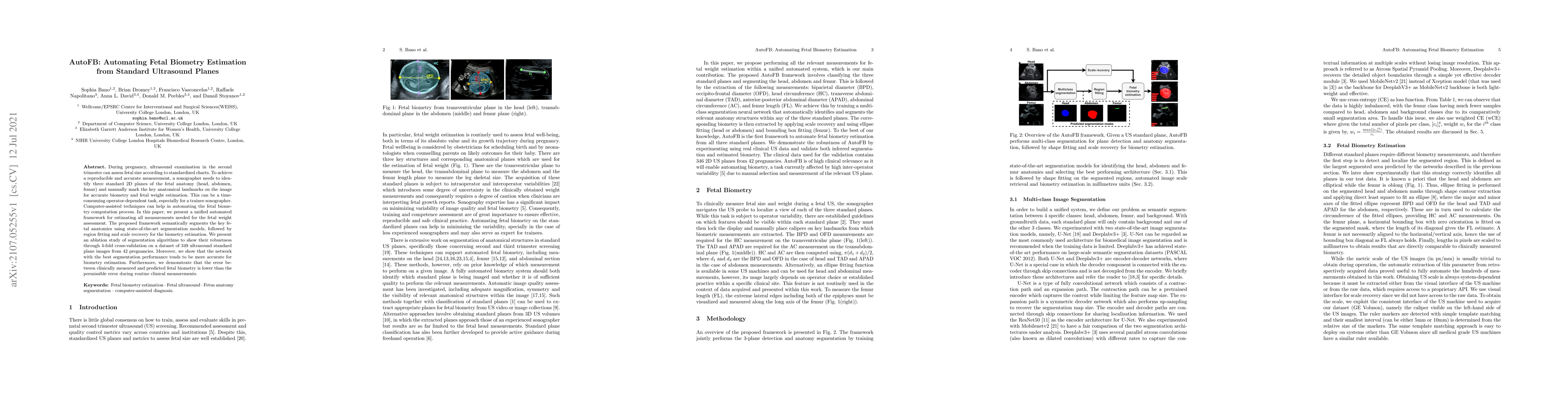 The research presents AutoFB, a unified framework for estimating fetal biometry from standard ultrasound planes. It uses state-of-the-art segmentation models for identifying key fetal anatomies (head, abdomen, femur) followed by shape fitting and scale recovery for biometry estimation.
