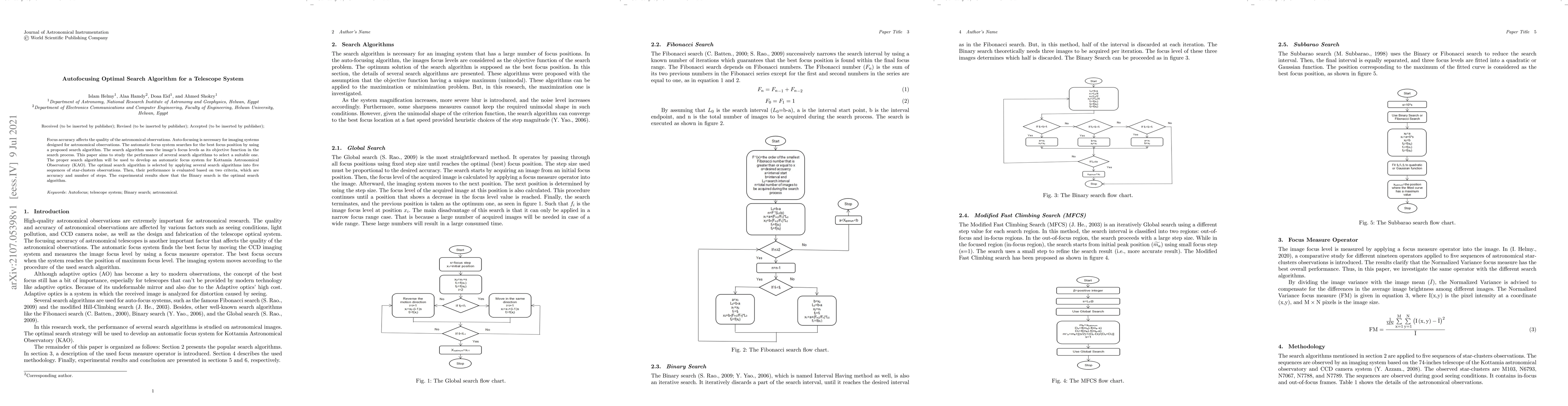 A research paper evaluates the performance of search algorithms to find the optimal auto-focusing method for telescope systems, ultimately selecting Binary search as the best option for improving focus accuracy.