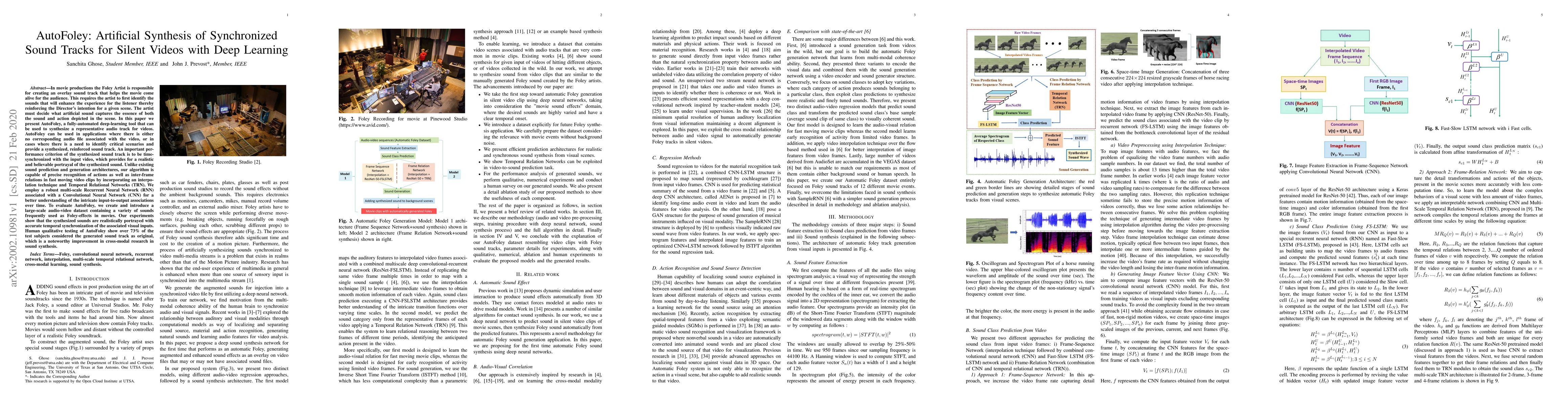 In movie productions, the Foley Artist is responsible for creating an overlay soundtrack that helps the movie come alive for the audience. This requires the artist to first identify the sounds that will enhance the experience for the listener thereby reinforcing the Directors's intention for a given scene. In this paper, we present AutoFoley, a fully-automated deep learning tool that can be used to synthesize a representative audio track for videos. AutoFoley can be used in the applications where there is either no corresponding audio file associated with the video or in cases where there is a need to identify critical scenarios and provide a synthesized, reinforced soundtrack. An important performance criterion of the synthesized soundtrack is to be time-synchronized with the input video, which provides for a realistic and believable portrayal of the synthesized sound. Unlike existing sound prediction and generation architectures, our algorithm is capable of precise recognition of actions as well as inter-frame relations in fast moving video clips by incorporating an interpolation technique and Temporal Relationship Networks (TRN). We employ a robust multi-scale Recurrent Neural Network (RNN) associated with a Convolutional Neural Network (CNN) for a better understanding of the intricate input-to-output associations over time. To evaluate AutoFoley, we create and introduce a large scale audio-video dataset containing a variety of sounds frequently used as Foley effects in movies. Our experiments show that the synthesized sounds are realistically portrayed with accurate temporal synchronization of the associated visual inputs. Human qualitative testing of AutoFoley show over 73% of the test subjects considered the generated soundtrack as original, which is a noteworthy improvement in cross-modal research in sound synthesis.