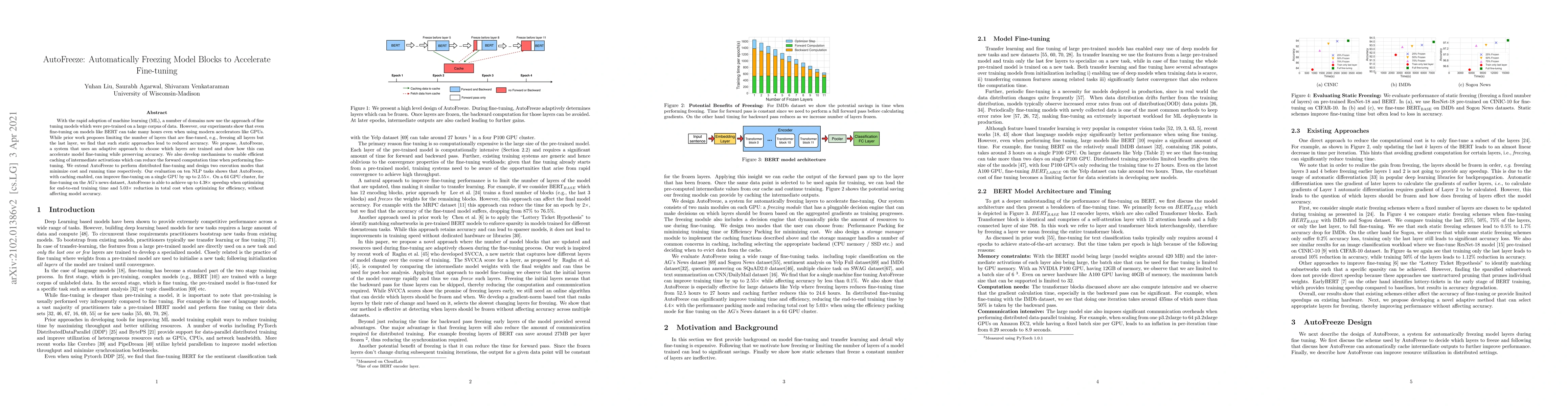 AutoFreeze is an adaptive system for accelerating fine-tuning of pre-trained models like BERT by dynamically freezing non-essential layers, while preserving accuracy. It also employs caching and distributed fine-tuning techniques to achieve significant speedups and cost reductions in fine-tuning processes.