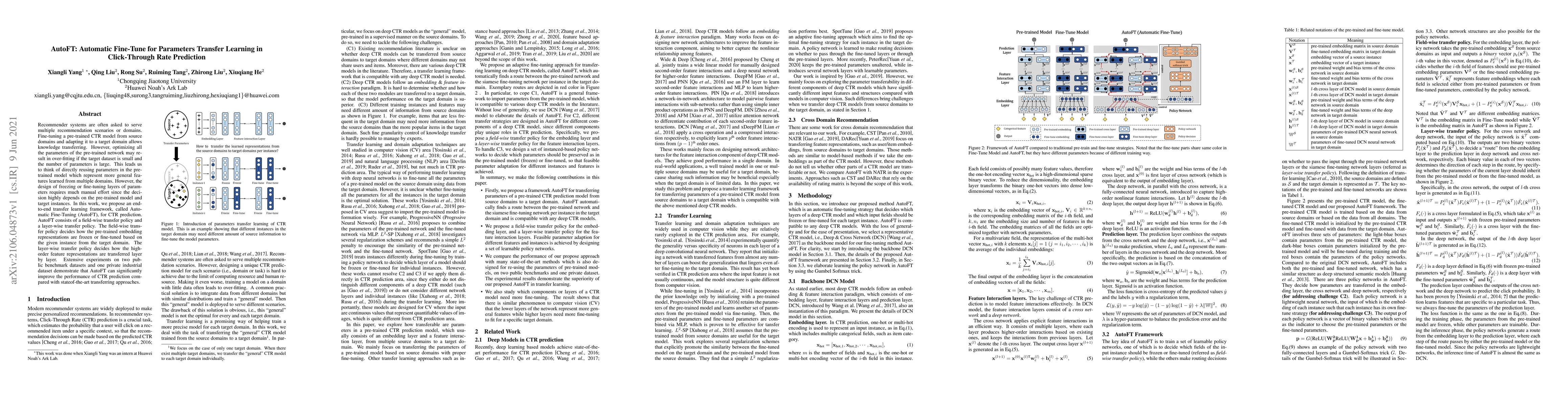 Recommender systems are often asked to serve multiple recommendation scenarios or domains. Fine-tuning a pre-trained CTR model from source domains and adapting it to a target domain allows knowledge transferring. However, optimizing all the parameters of the pre-trained network may result in over-fitting if the target dataset is small and the number of parameters is large. This leads us to think of directly reusing parameters in the pre-trained model which represent more general features learned from multiple domains. However, the design of freezing or fine-tuning layers of parameters requires much manual effort since the decision highly depends on the pre-trained model and target instances. In this work, we propose an end-to-end transfer learning framework, called Automatic Fine-Tuning (AutoFT), for CTR prediction. AutoFT consists of a field-wise transfer policy and a layer-wise transfer policy. The field-wise transfer policy decides how the pre-trained embedding representations are frozen or fine-tuned based on the given instance from the target domain. The layer-wise transfer policy decides how the high?order feature representations are transferred layer by layer. Extensive experiments on two public benchmark datasets and one private industrial dataset demonstrate that AutoFT can significantly improve the performance of CTR prediction compared with state-of-the-art transferring approaches.