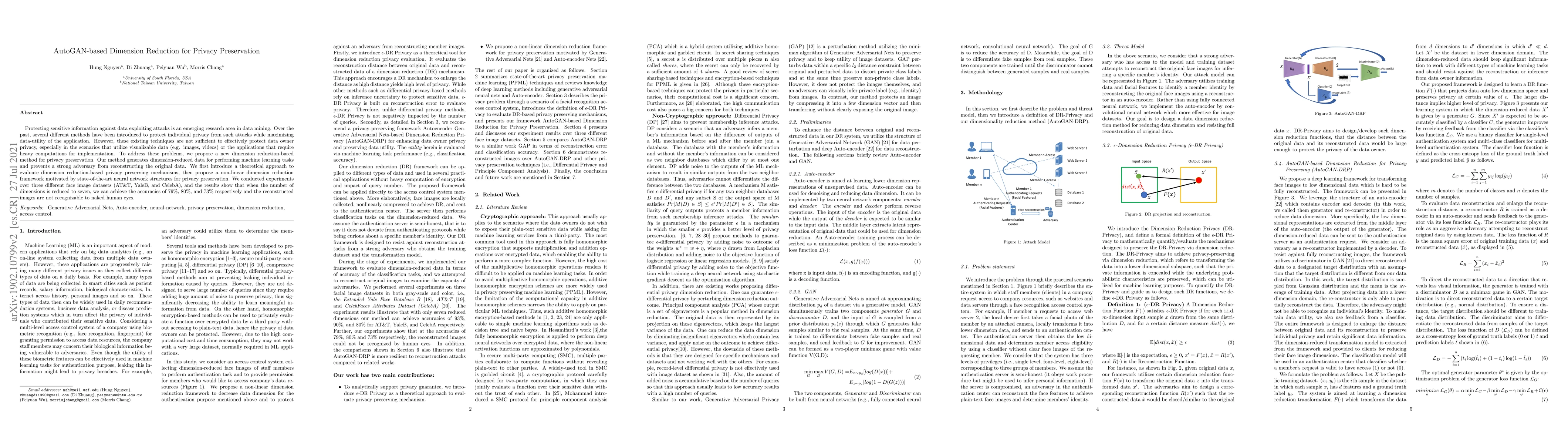Researchers propose a new method for protecting sensitive data using AutoGAN-based dimension reduction, achieving high accuracy while preventing adversaries from reconstructing the original data.