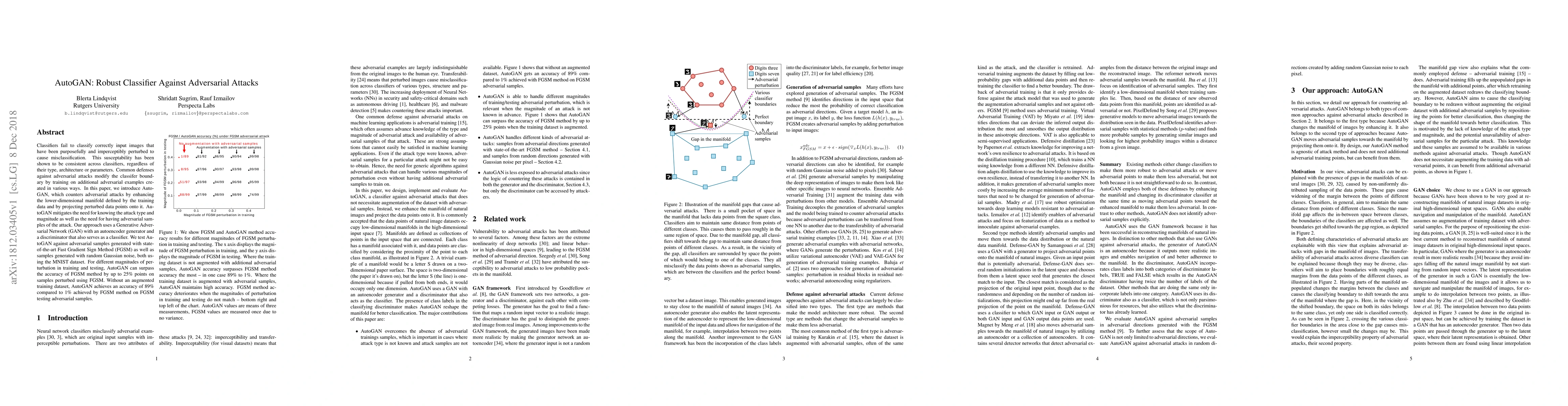 AutoGAN employs a GAN with an autoencoder to enhance the training data's lower-dimensional manifold, effectively countering adversarial attacks without needing specific attack information. It outperforms traditional FGSM-based defenses on adversarial samples, achieving up to 25% higher accuracy.