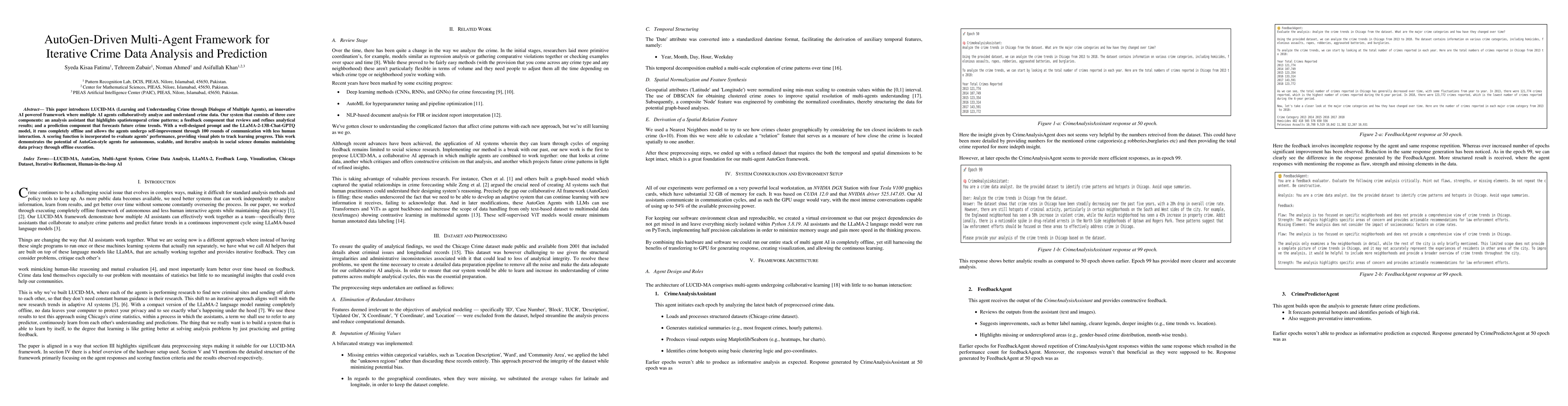 The paper presents LUCID-MA, an AI framework with multiple agents that collaboratively analyze crime data, identify patterns, refine results, and predict trends. It operates offline using the LLaMA-2-13B-Chat-GPTQ model, self-improving through 100 rounds of communication with minimal human intervention. The system's performance is evaluated via a scoring function, demonstrating potential for autonomous, scalable, and privacy-preserving data analysis in social sciences.