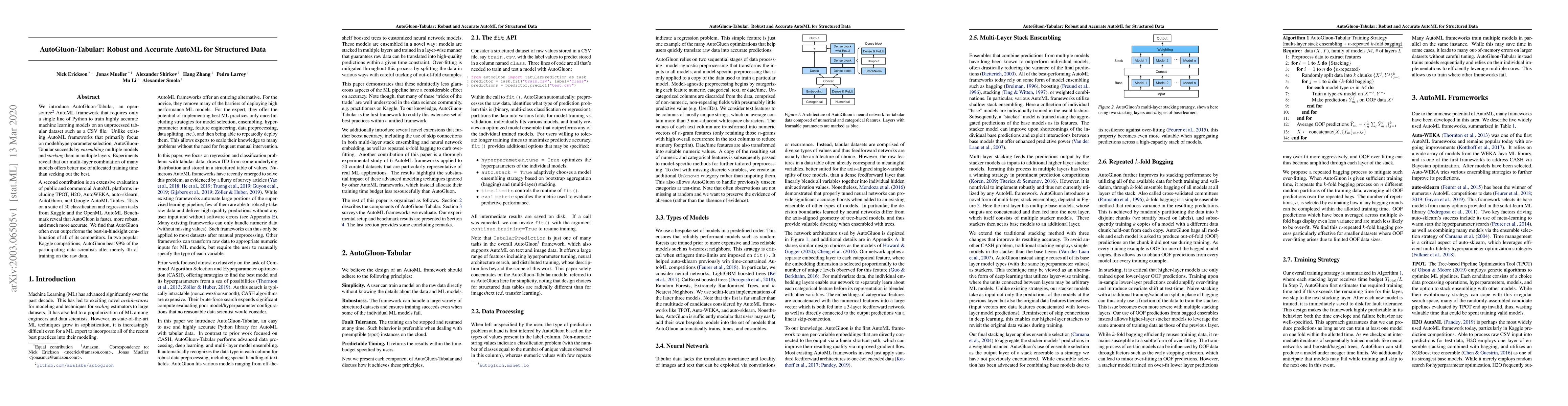 AutoGluon-Tabular is an open-source AutoML framework that trains highly accurate machine learning models on tabular data with minimal effort. It outperforms existing AutoML frameworks by ensembling and stacking multiple models, demonstrating superior accuracy, robustness, and speed across various datasets.