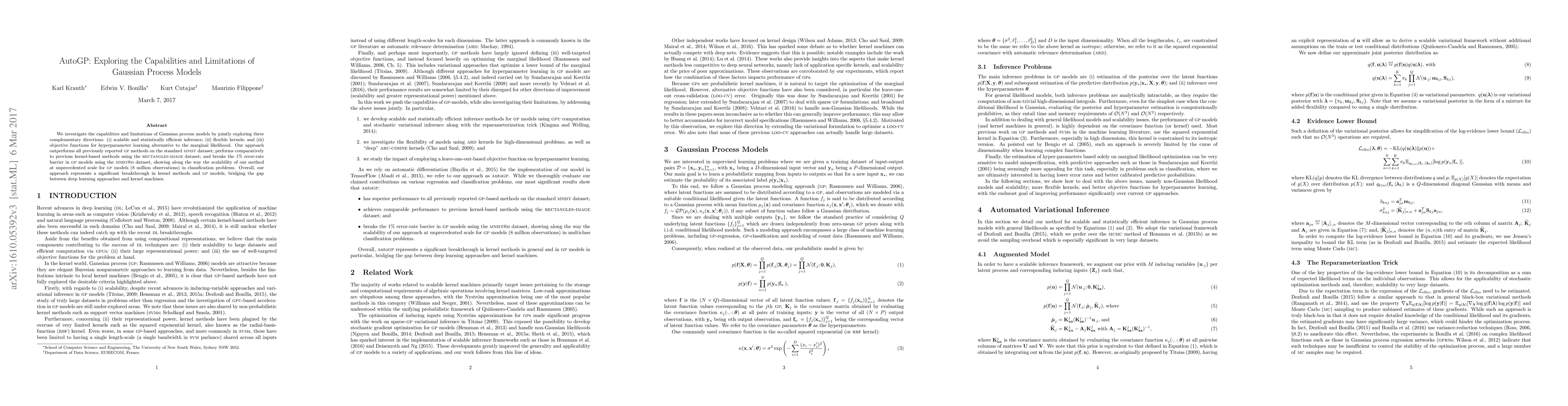 We investigate the capabilities and limitations of Gaussian process models by jointly exploring three complementary directions: (i) scalable and statistically efficient inference; (ii) flexible kernels; and (iii) objective functions for hyperparameter learning alternative to the marginal likelihood. Our approach outperforms all previously reported GP methods on the standard MNIST dataset; performs comparatively to previous kernel-based methods using the RECTANGLES-IMAGE dataset; and breaks the 1% error-rate barrier in GP models using the MNIST8M dataset, showing along the way the scalability of our method at unprecedented scale for GP models (8 million observations) in classification problems. Overall, our approach represents a significant breakthrough in kernel methods and GP models, bridging the gap between deep learning approaches and kernel machines.