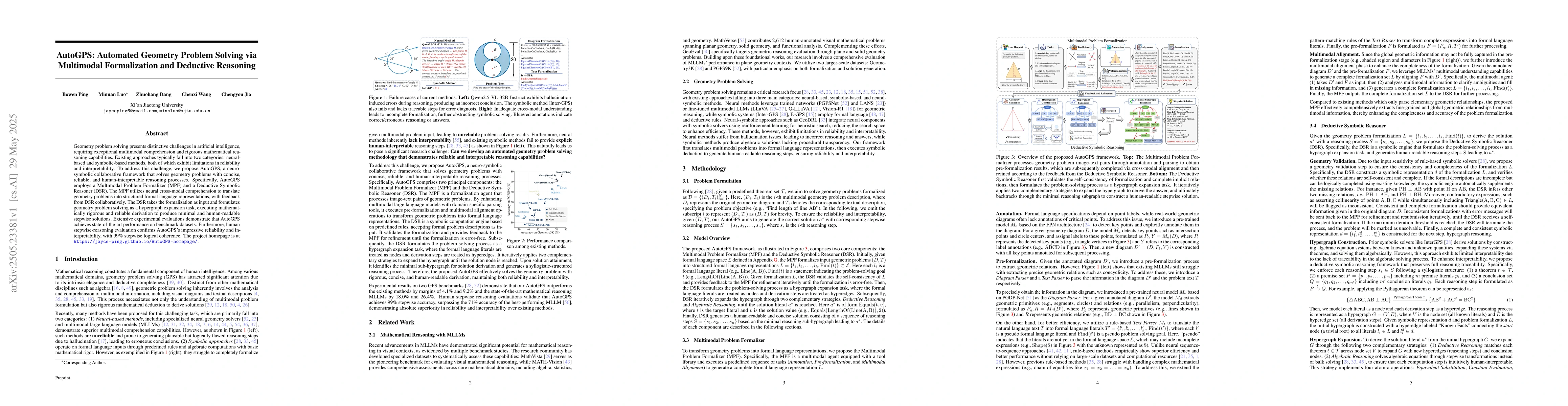 AutoGPS employs a Multimodal Problem Formalizer (MPF) and a Deductive Symbolic Reasoner (DSR). The MPF uses neural cross-modal comprehension to convert geometry problems into structured formal language representations, with feedback from DSR. The DSR then solves the problem by formulating it as a hypergraph expansion task, ensuring mathematically rigorous and reliable derivations.