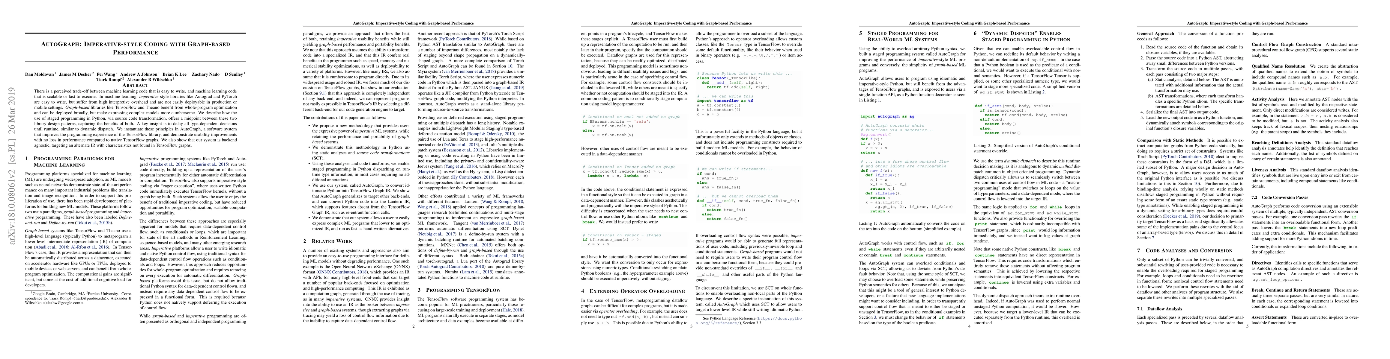 There is a perceived trade-off between machine learning code that is easy to write, and machine learning code that is scalable or fast to execute. In machine learning, imperative style libraries like Autograd and PyTorch are easy to write, but suffer from high interpretive overhead and are not easily deployable in production or mobile settings. Graph-based libraries like TensorFlow and Theano benefit from whole-program optimization and can be deployed broadly, but make expressing complex models more cumbersome. We describe how the use of staged programming in Python, via source code transformation, offers a midpoint between these two library design patterns, capturing the benefits of both. A key insight is to delay all type-dependent decisions until runtime, via dynamic dispatch. We instantiate these principles in AutoGraph, a software system that improves the programming experience of the TensorFlow library, and demonstrate usability improvements with no loss in performance compared to native TensorFlow graphs. We also show that our system is backend agnostic, and demonstrate targeting an alternate IR with characteristics not found in TensorFlow graphs.