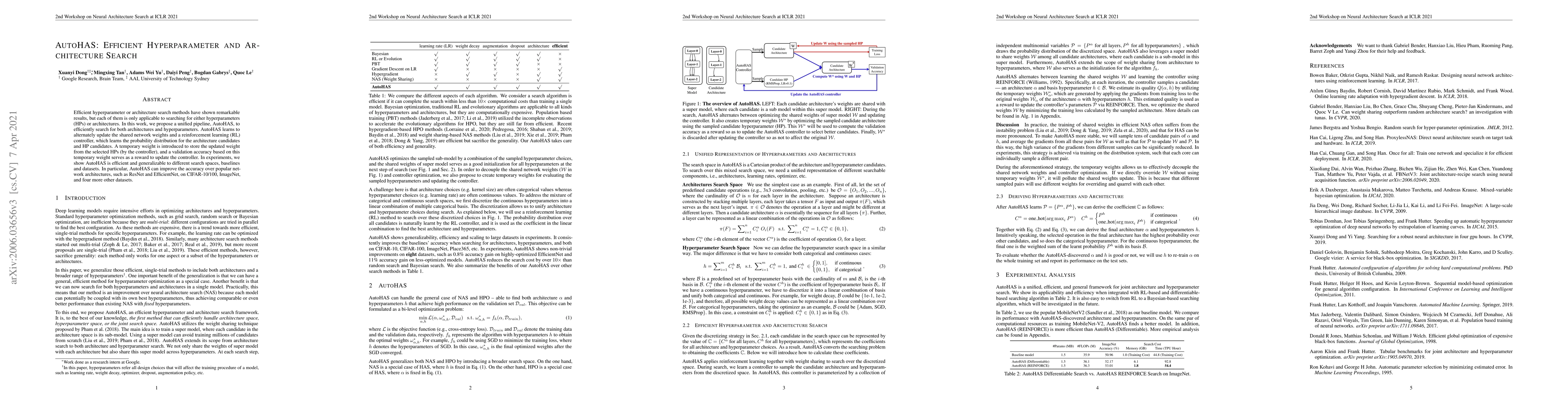 Efficient hyperparameter or architecture search methods have shown remarkable results, but each of them is only applicable to searching for either hyperparameters (HPs) or architectures. In this work, we propose a unified pipeline, AutoHAS, to efficiently search for both architectures and hyperparameters. AutoHAS learns to alternately update the shared network weights and a reinforcement learning (RL) controller, which learns the probability distribution for the architecture candidates and HP candidates. A temporary weight is introduced to store the updated weight from the selected HPs (by the controller), and a validation accuracy based on this temporary weight serves as a reward to update the controller. In experiments, we show AutoHAS is efficient and generalizable to different search spaces, baselines and datasets. In particular, AutoHAS can improve the accuracy over popular network architectures, such as ResNet and EfficientNet, on CIFAR-10/100, ImageNet, and four more other datasets.